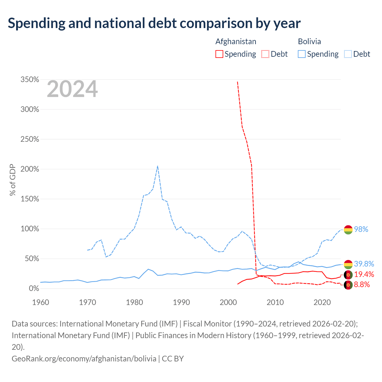 Afghanistan has $1.44B in government debt (8.8% of GDP), compared to $53.8B (98% of GDP) in Bolivia.