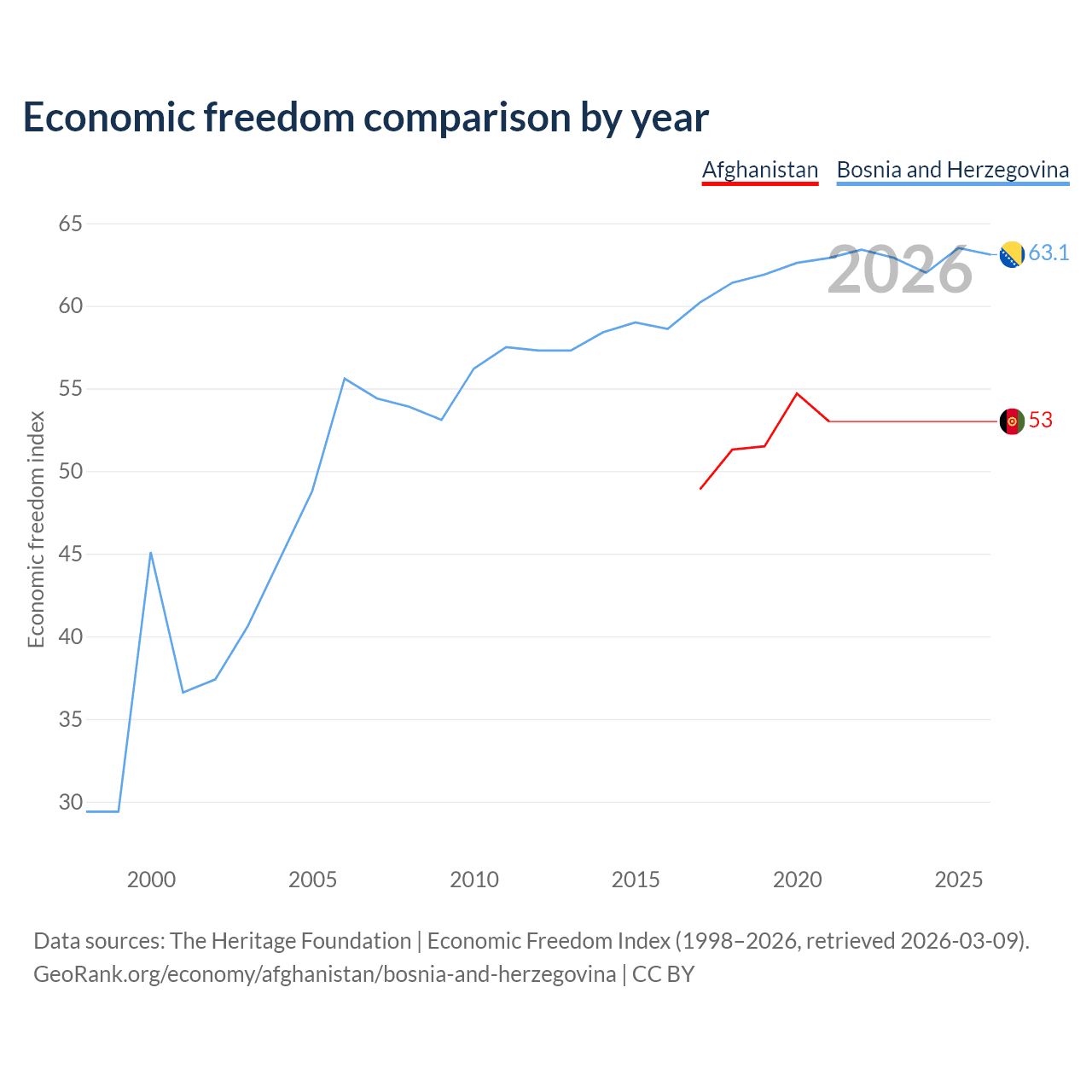 The Economic Freedom Index for Afghanistan is 53, ranking 142/197, compared to 63.1 for Bosnia and Herzegovina, ranking 83/197. The chart above displays a comparison of annual changes in economic freedom indexes.