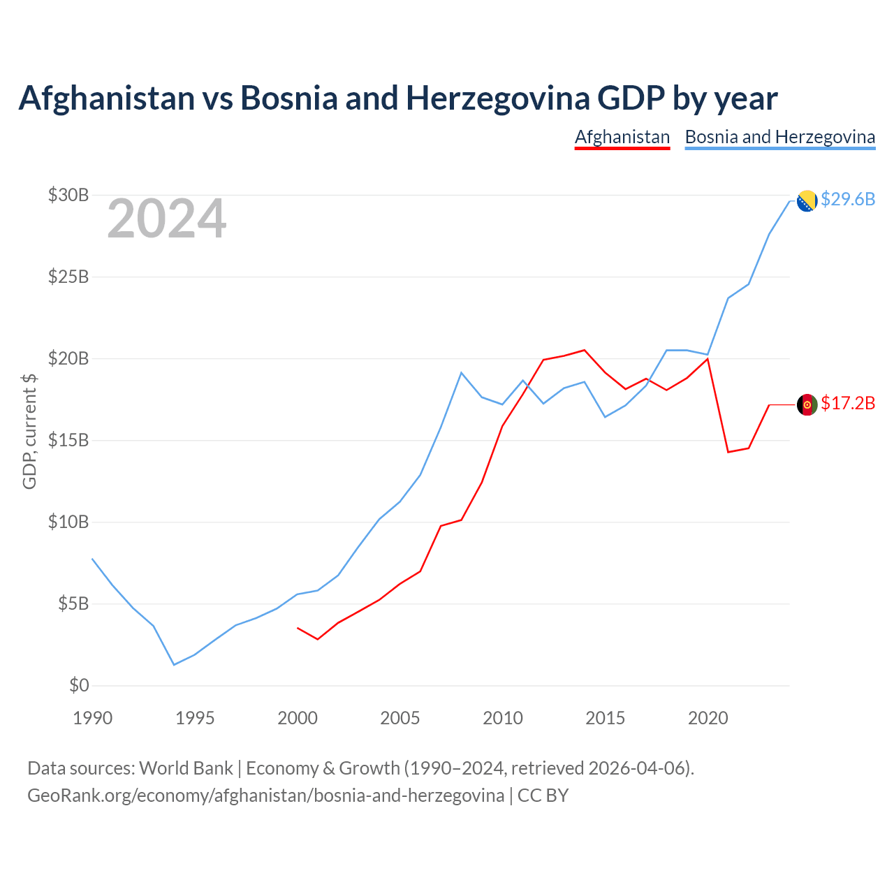 Afghanistan vs Bosnia and Herzegovina GDP by year