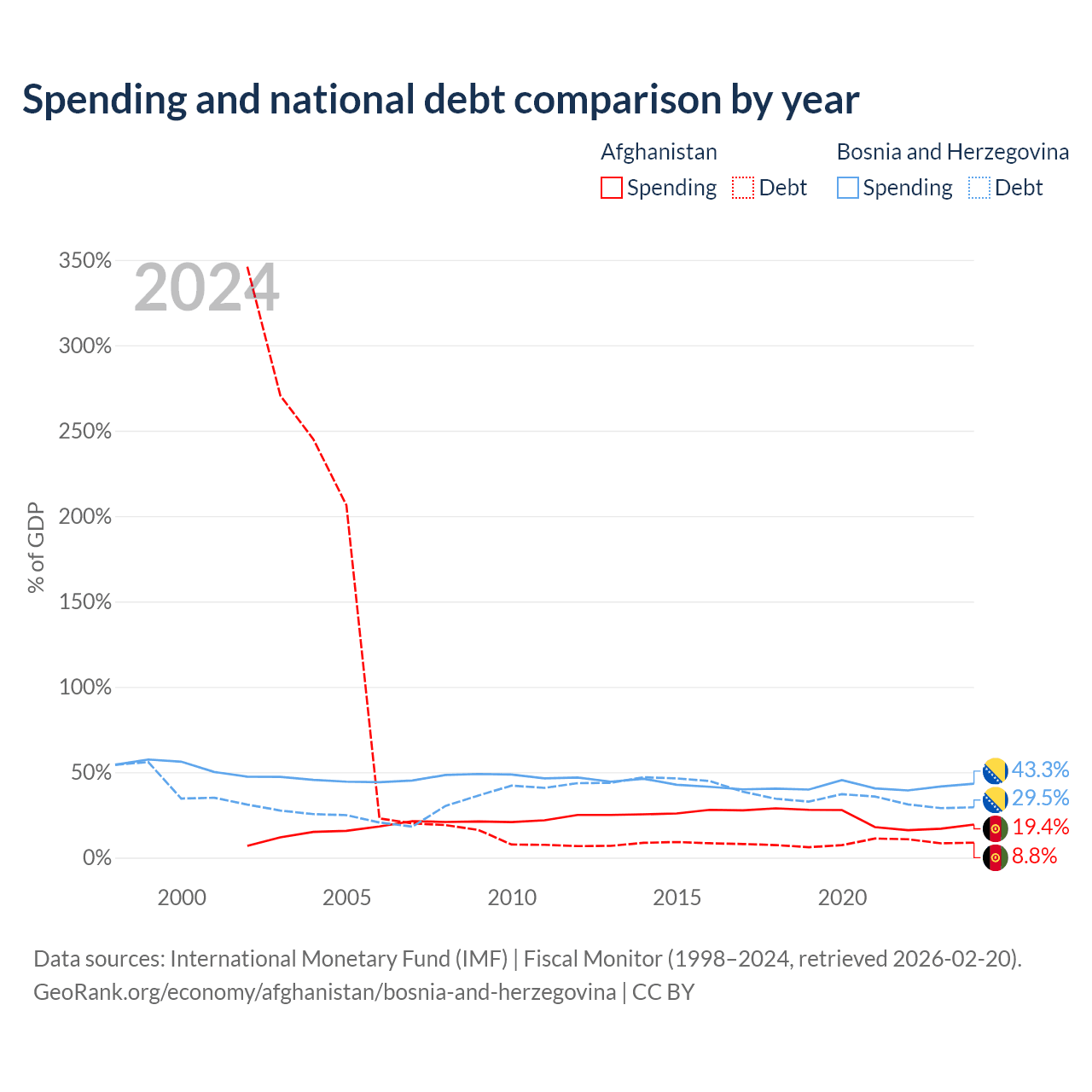 Afghanistan has $1.44B in government debt (8.8% of GDP), compared to $8.74B (29.5% of GDP) in Bosnia and Herzegovina.