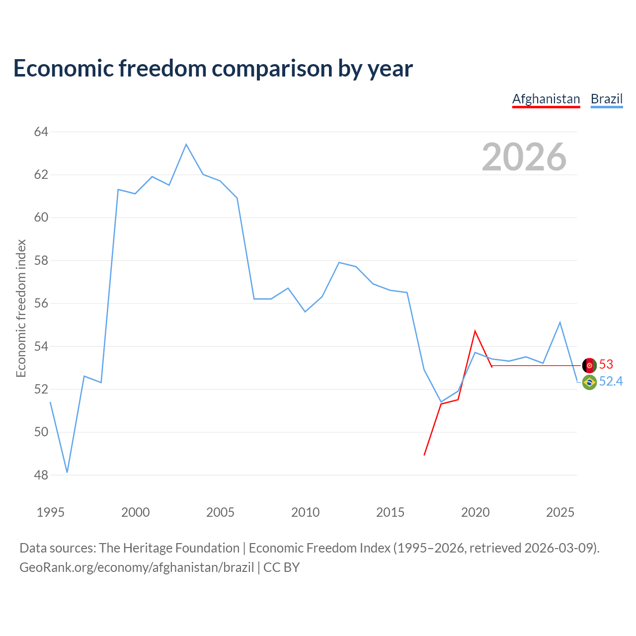 The Economic Freedom Index for Afghanistan is 53, ranking 142/197, compared to 52.4 for Brazil, ranking 148/197. The chart above displays a comparison of annual changes in economic freedom indexes.
