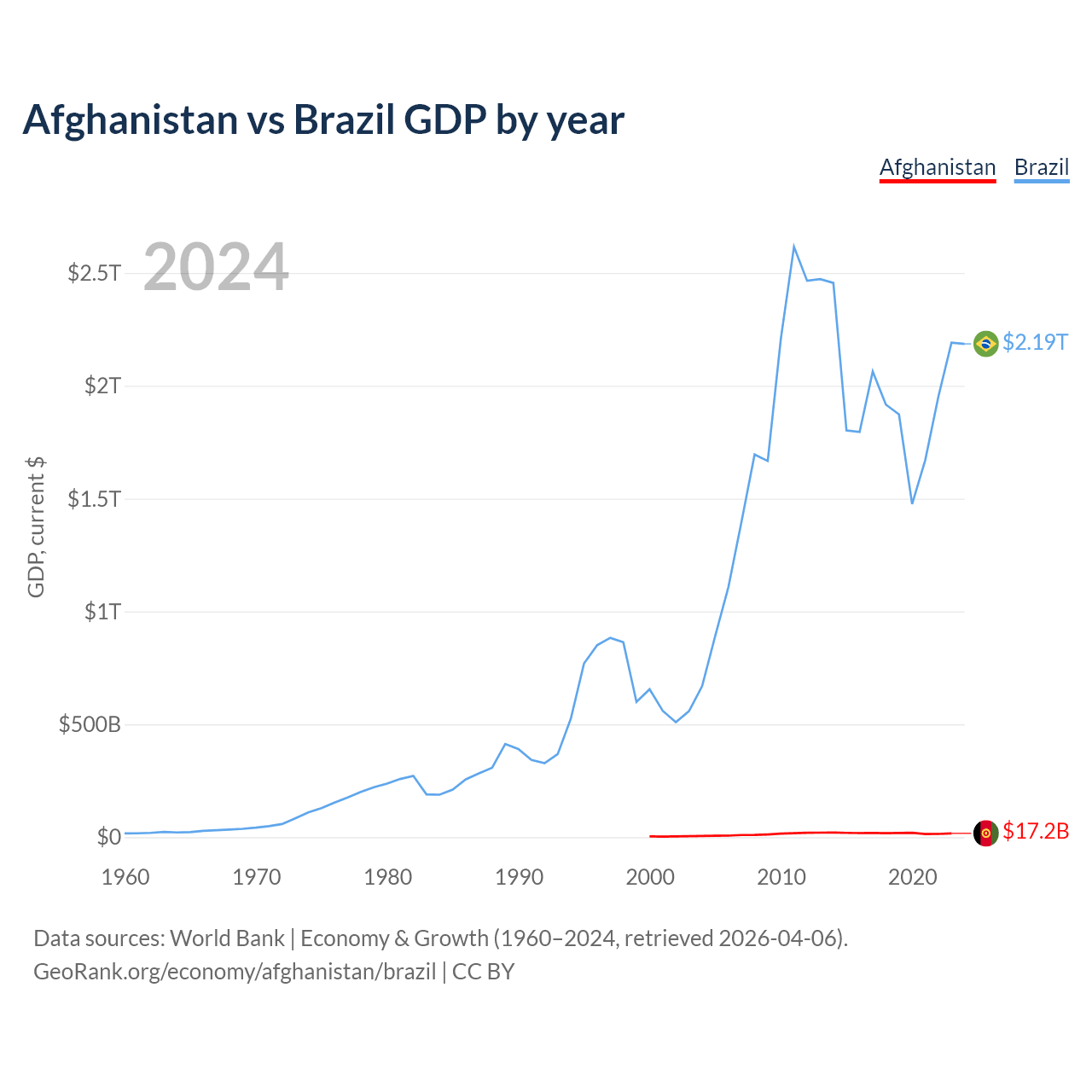 Afghanistan has a GDP of $17.2B compared to $2.19T for Brazil, ranking 137/197 and 10/197 by economy size, respectively.