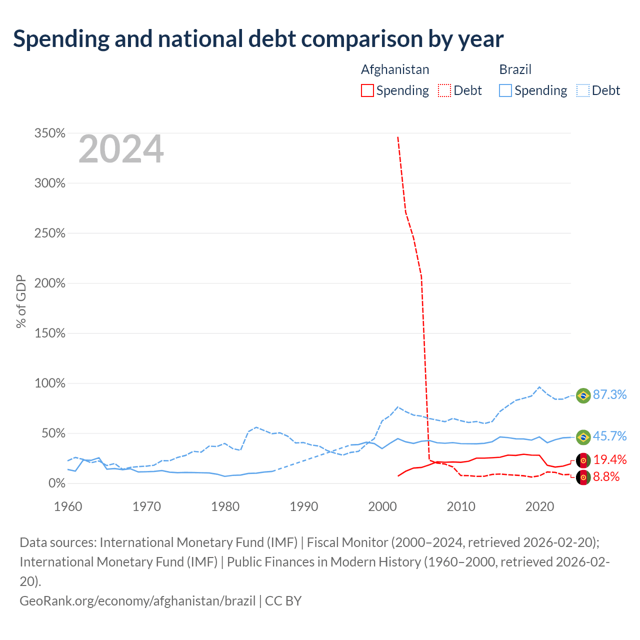 Afghanistan has $1.44B in government debt (8.8% of GDP), compared to $1.91T (87.3% of GDP) in Brazil.
