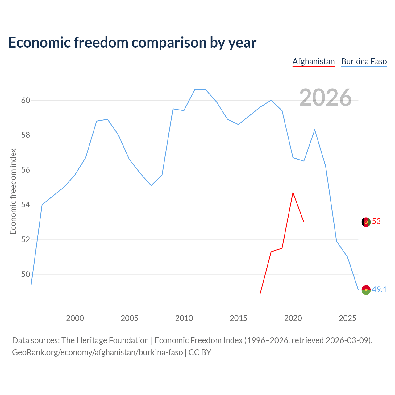 The Economic Freedom Index for Afghanistan is 53, ranking 142/197, compared to 49.1 for Burkina Faso, ranking 167/197. The chart above displays a comparison of annual changes in economic freedom indexes.