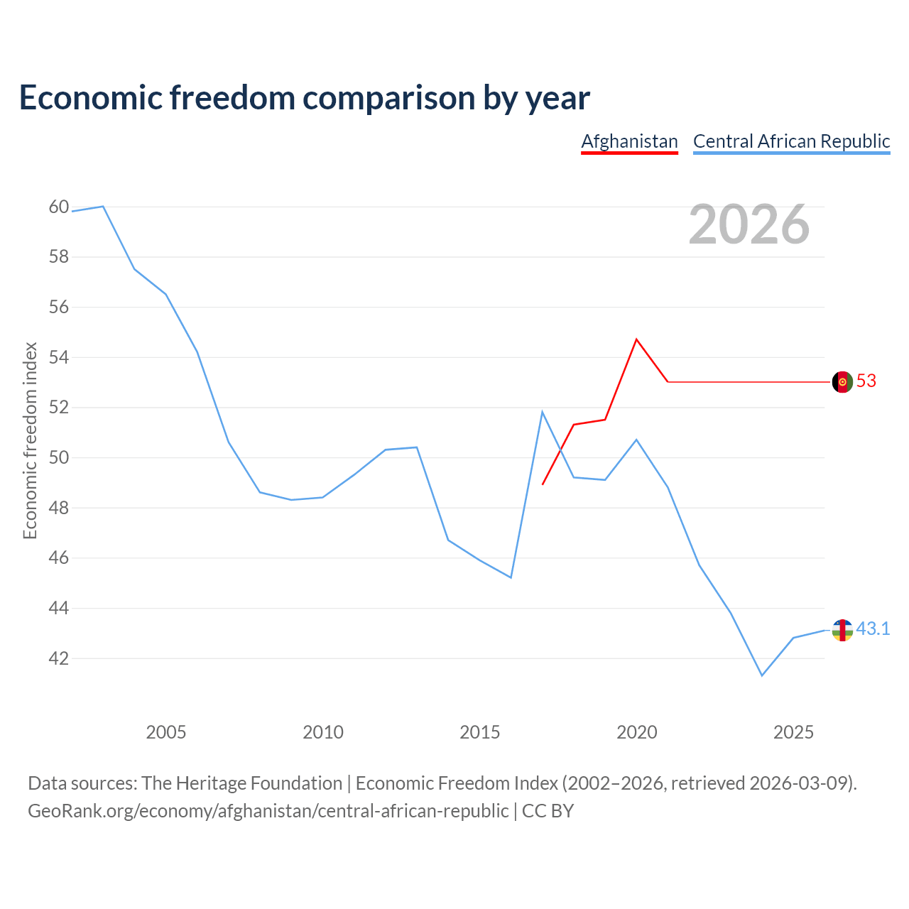 The Economic Freedom Index for Afghanistan is 53, ranking 142/197, compared to 43.1 for the Central African Republic, ranking 182/197. The chart above displays a comparison of annual changes in economic freedom indexes.
