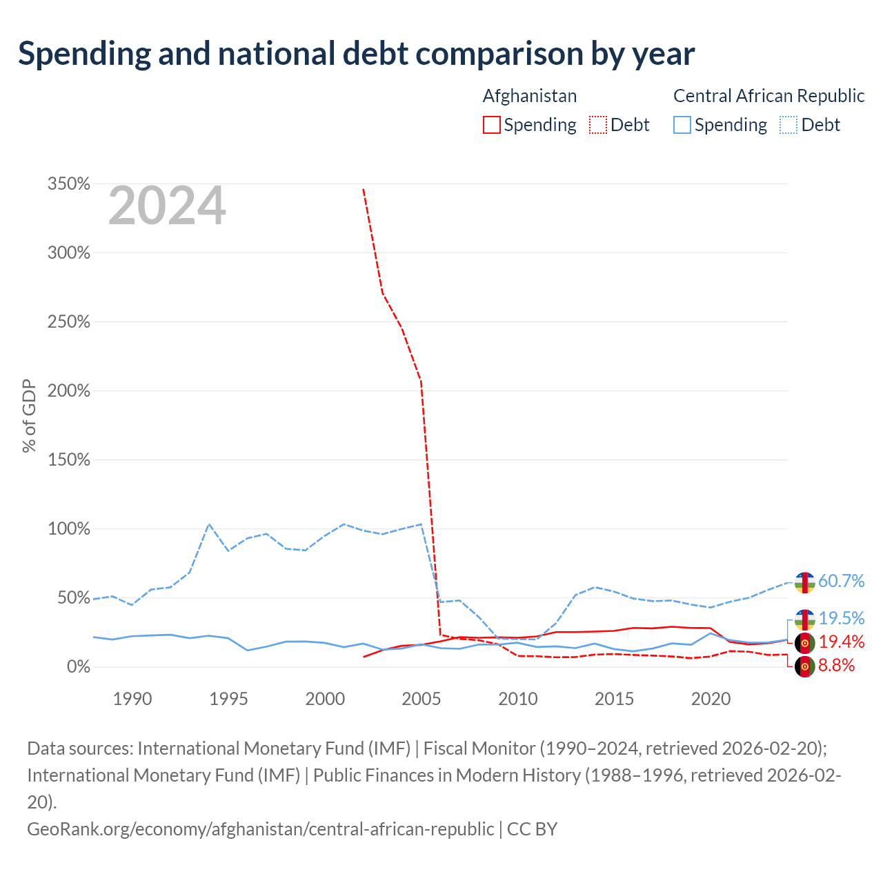 Afghanistan has $1.44B in government debt (8.8% of GDP), compared to $1.67B (60.7% of GDP) in the Central African Republic.