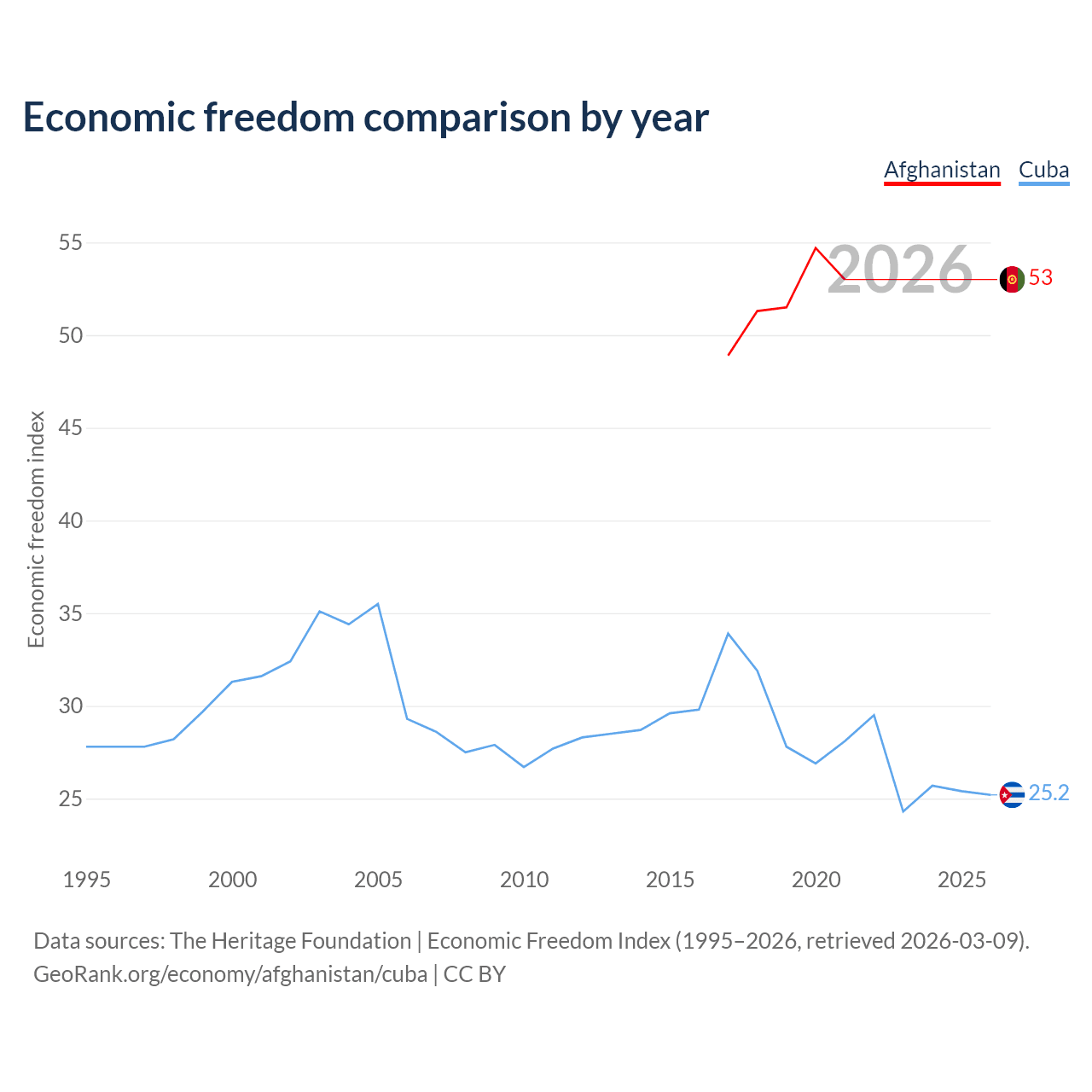 The Economic Freedom Index for Afghanistan is 53, ranking 142/197, compared to 25.2 for Cuba, ranking 195/197. The chart above displays a comparison of annual changes in economic freedom indexes.