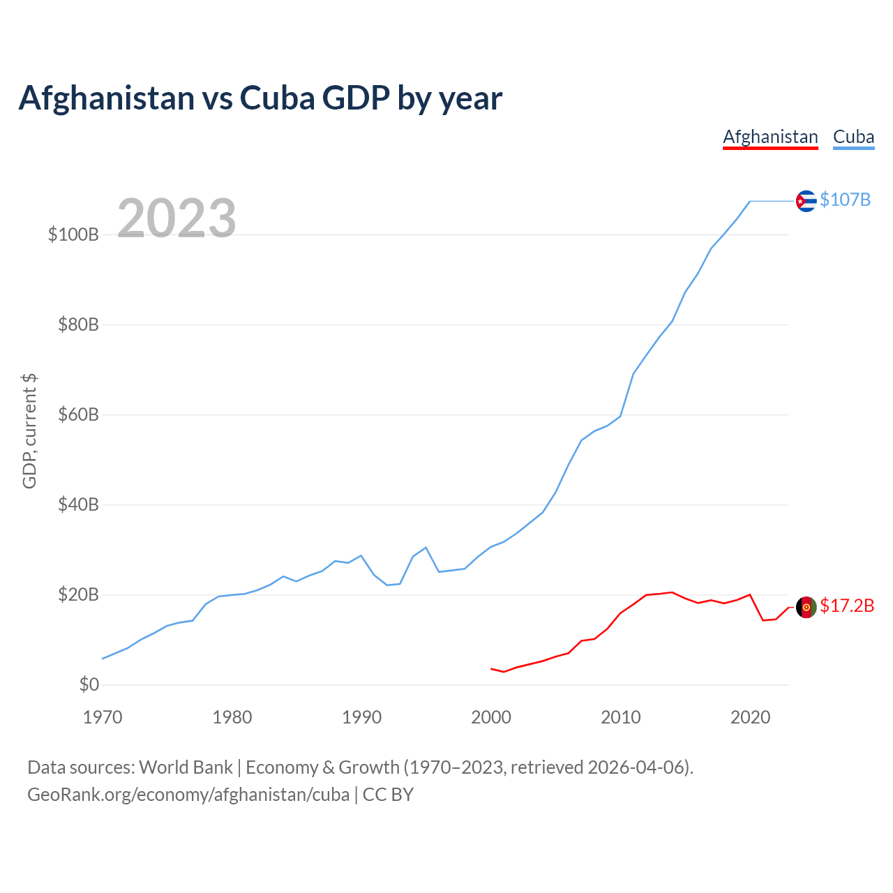 Afghanistan has a GDP of $17.2B compared to $107B for Cuba, ranking 137/197 and 69/197 by economy size, respectively.
