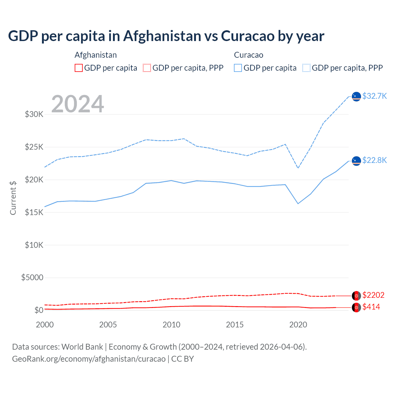 Afghanistan's GDP per capita is $414, ranking 196/197, compared to $22,833 in Curacao, ranking 56/197. Adjusted for purchasing power (GDP per capita PPP), Afghanistan ranks 184th at $2,202, while Curacao ranks 70th at $32,693.
