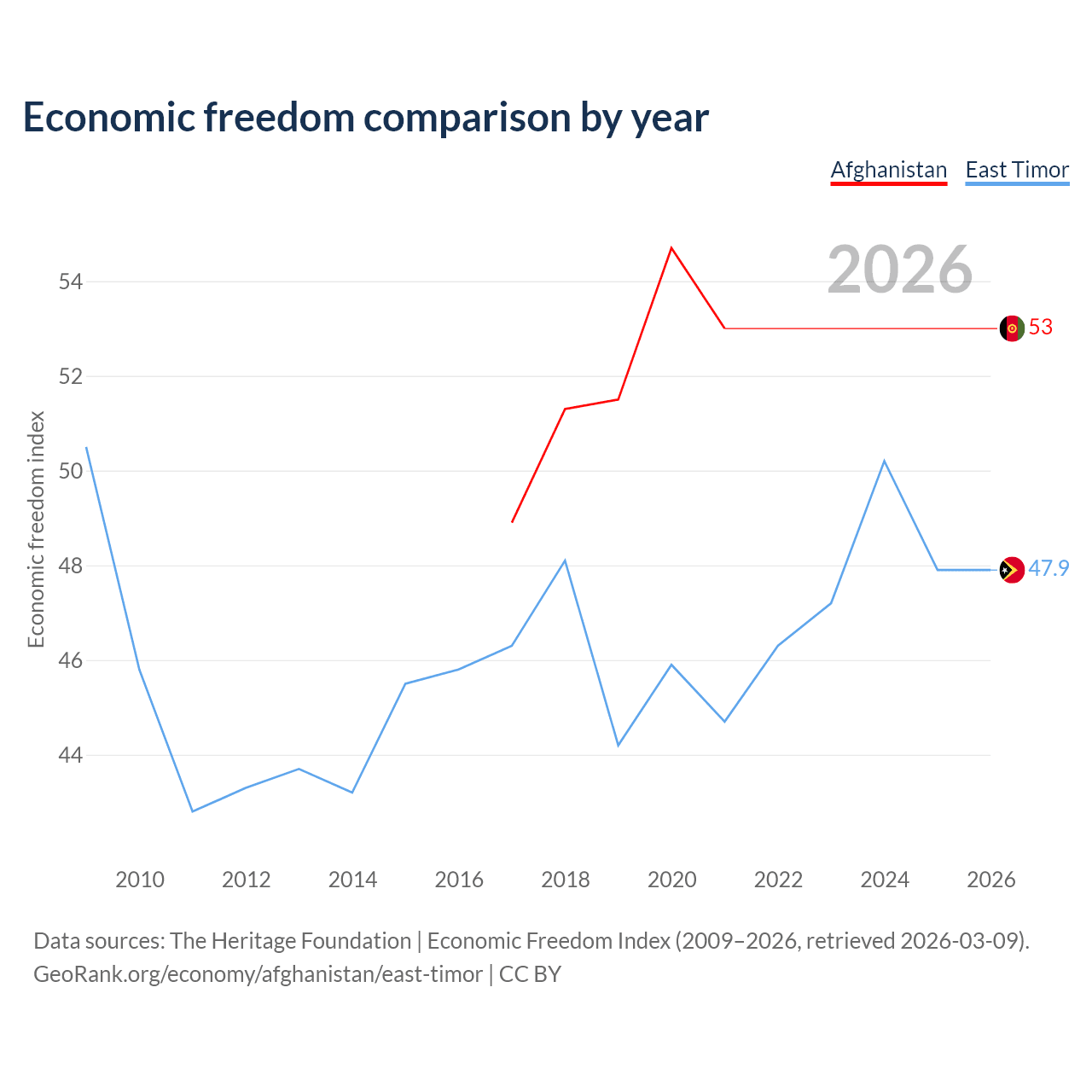 The Economic Freedom Index for Afghanistan is 53, ranking 142/197, compared to 47.9 for East Timor, ranking 173/197. The chart above displays a comparison of annual changes in economic freedom indexes.