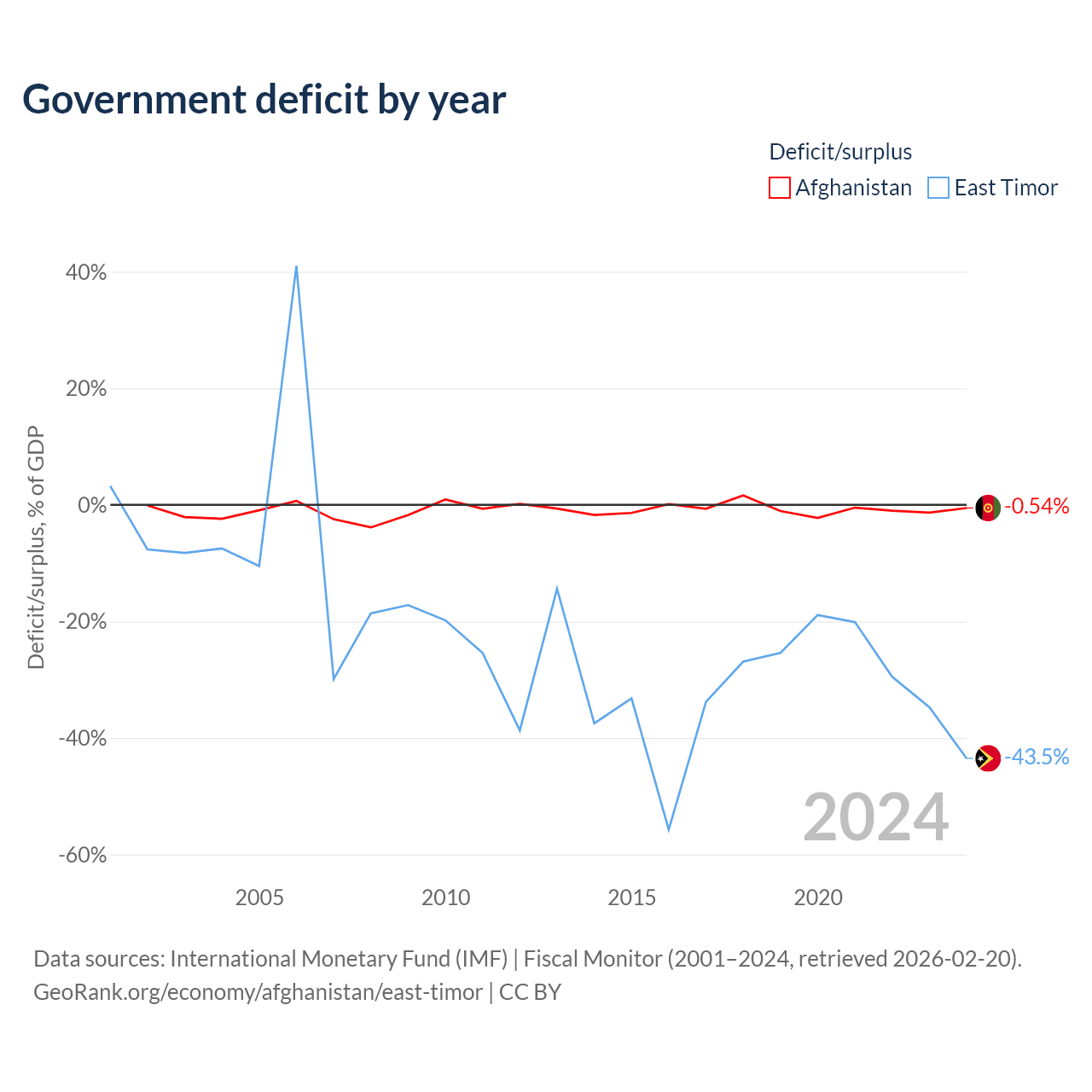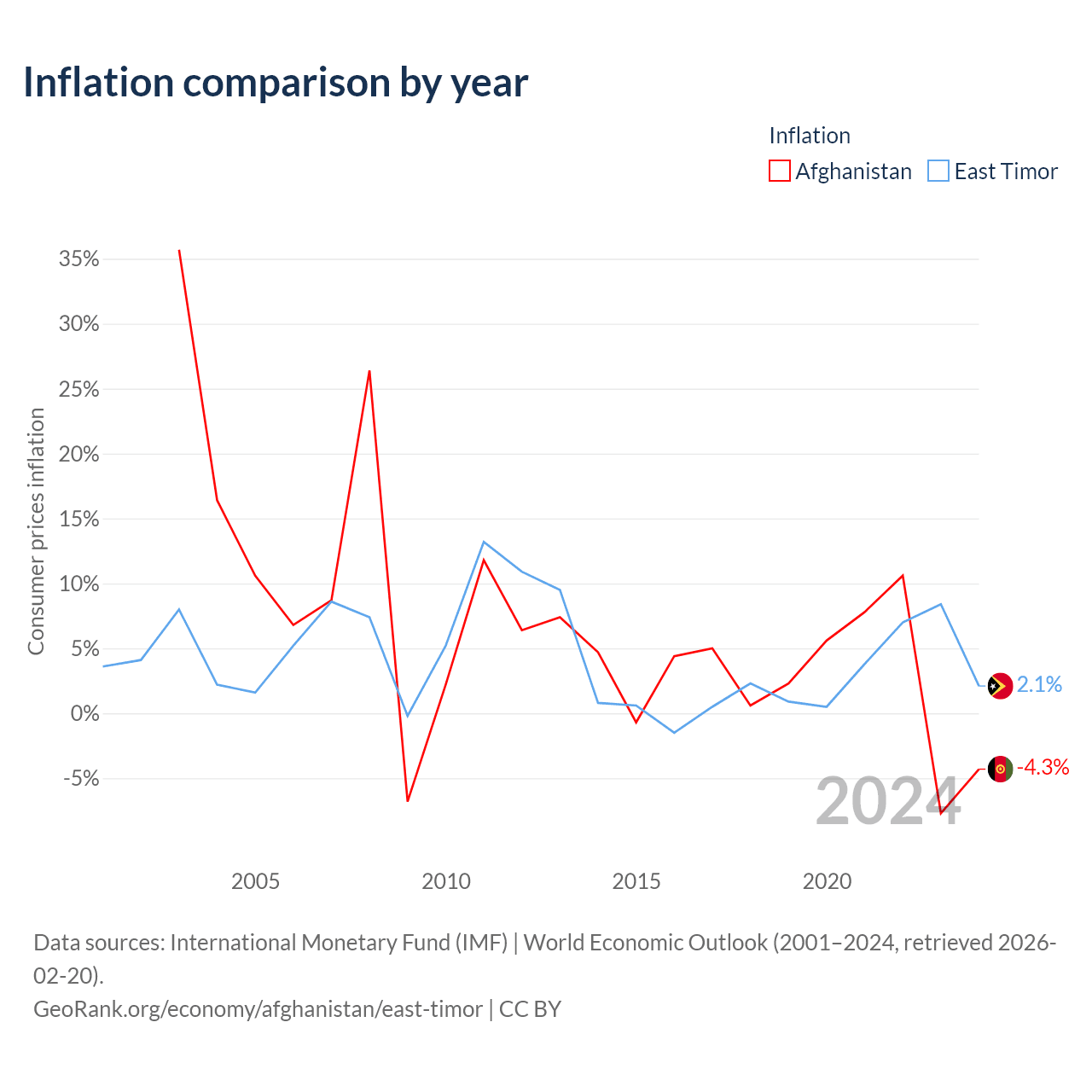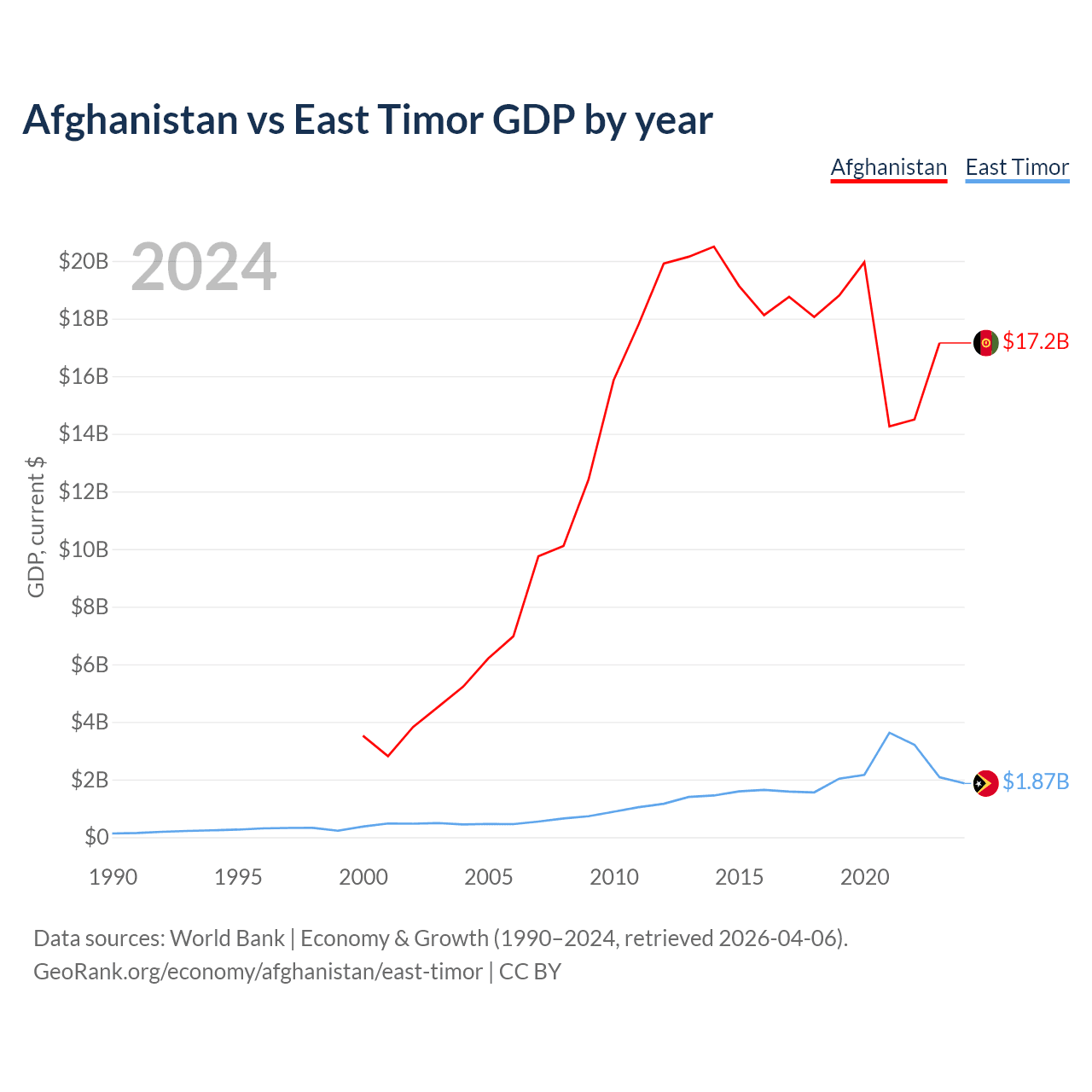 Afghanistan has a GDP of $17.2B compared to $1.87B for East Timor, ranking 137/197 and 181/197 by economy size, respectively.