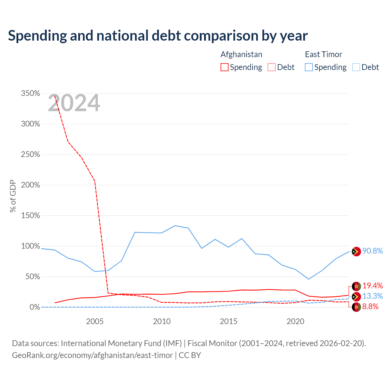 Afghanistan has $1.44B in government debt (8.8% of GDP), compared to $249M (13.3% of GDP) in East Timor.