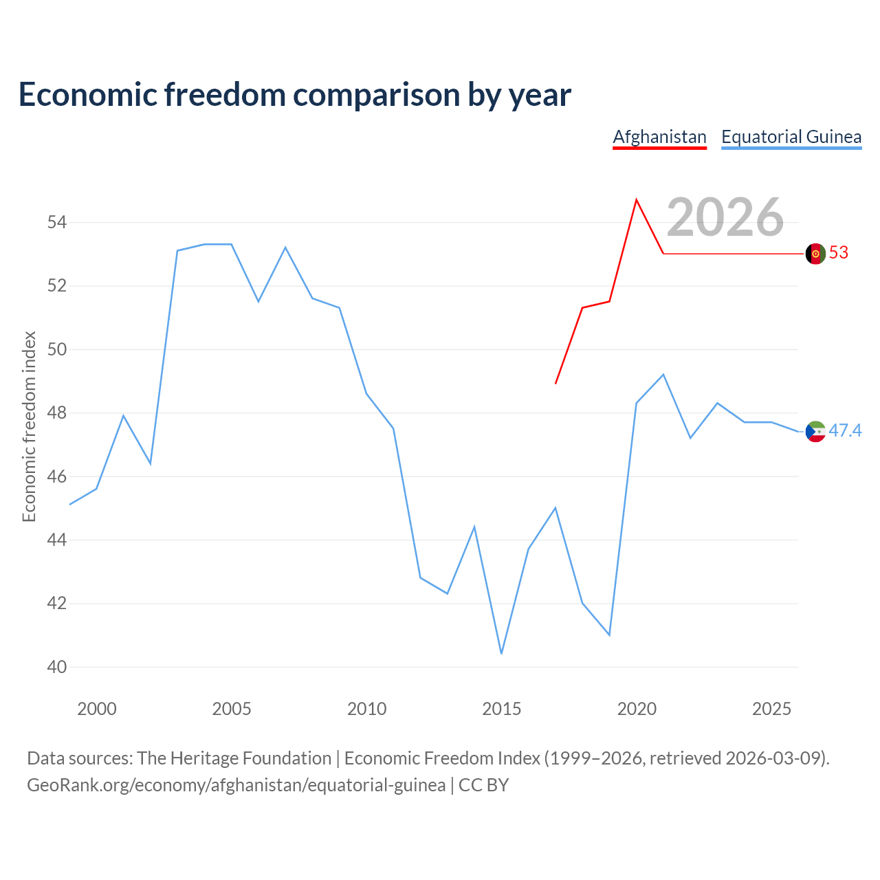 The Economic Freedom Index for Afghanistan is 53, ranking 142/197, compared to 47.4 for Equatorial Guinea, ranking 175/197. The chart above displays a comparison of annual changes in economic freedom indexes.