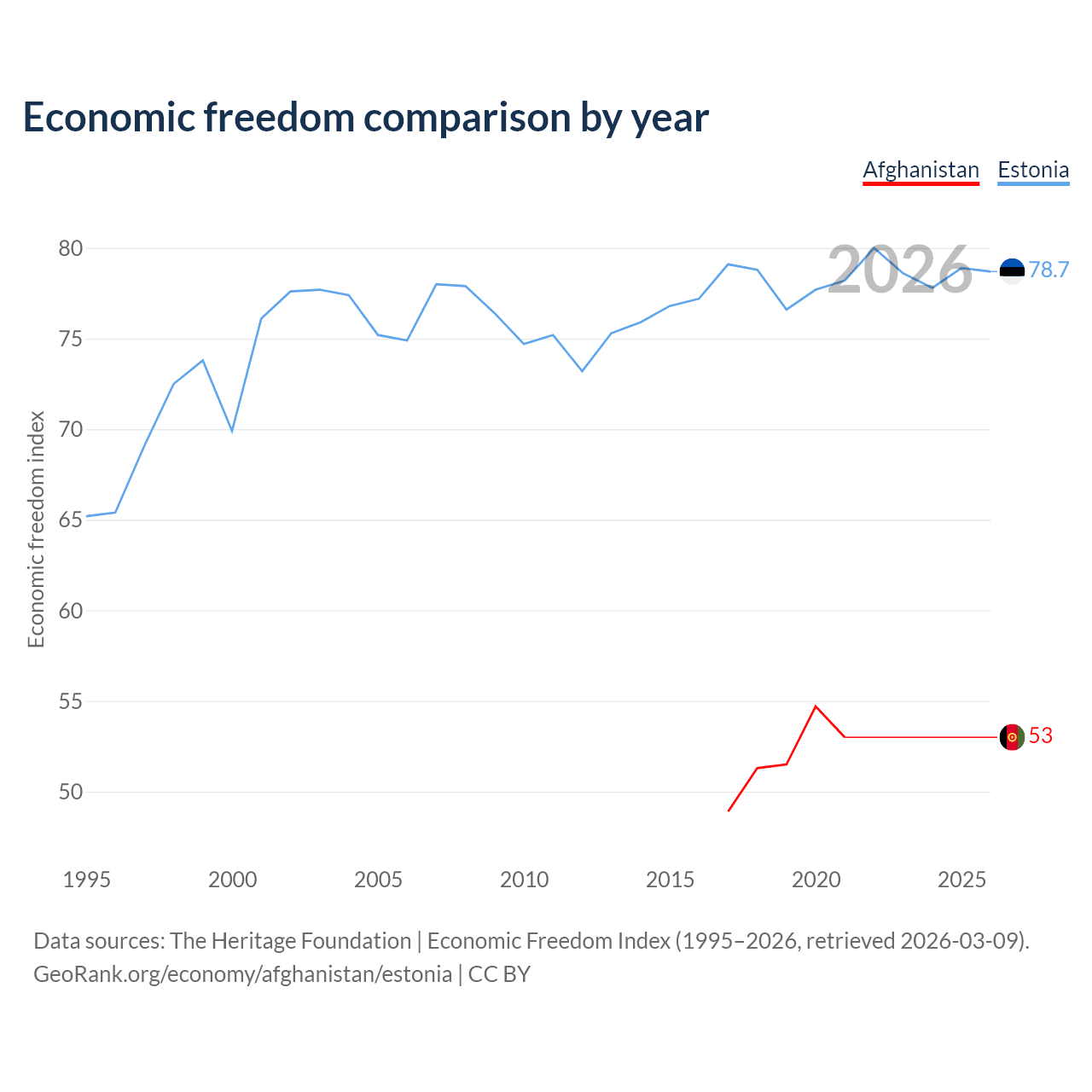 The Economic Freedom Index for Afghanistan is 53, ranking 142/197, compared to 78.7 for Estonia, ranking 10/197. The chart above displays a comparison of annual changes in economic freedom indexes.