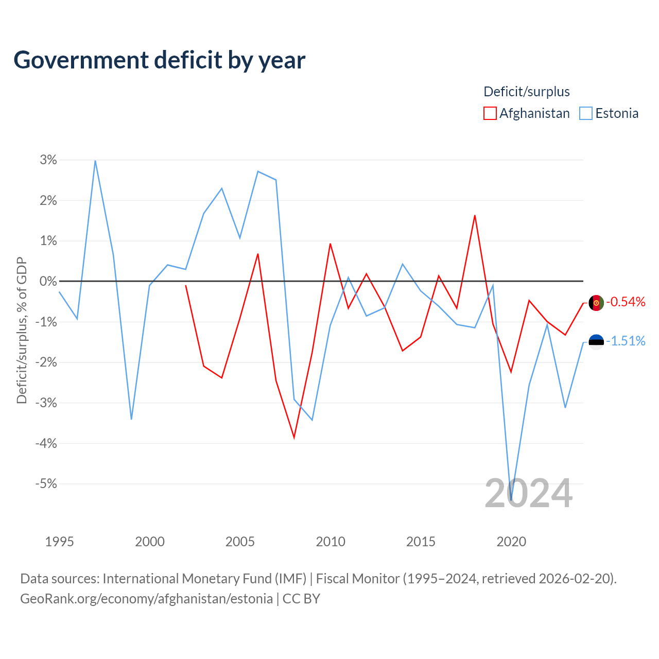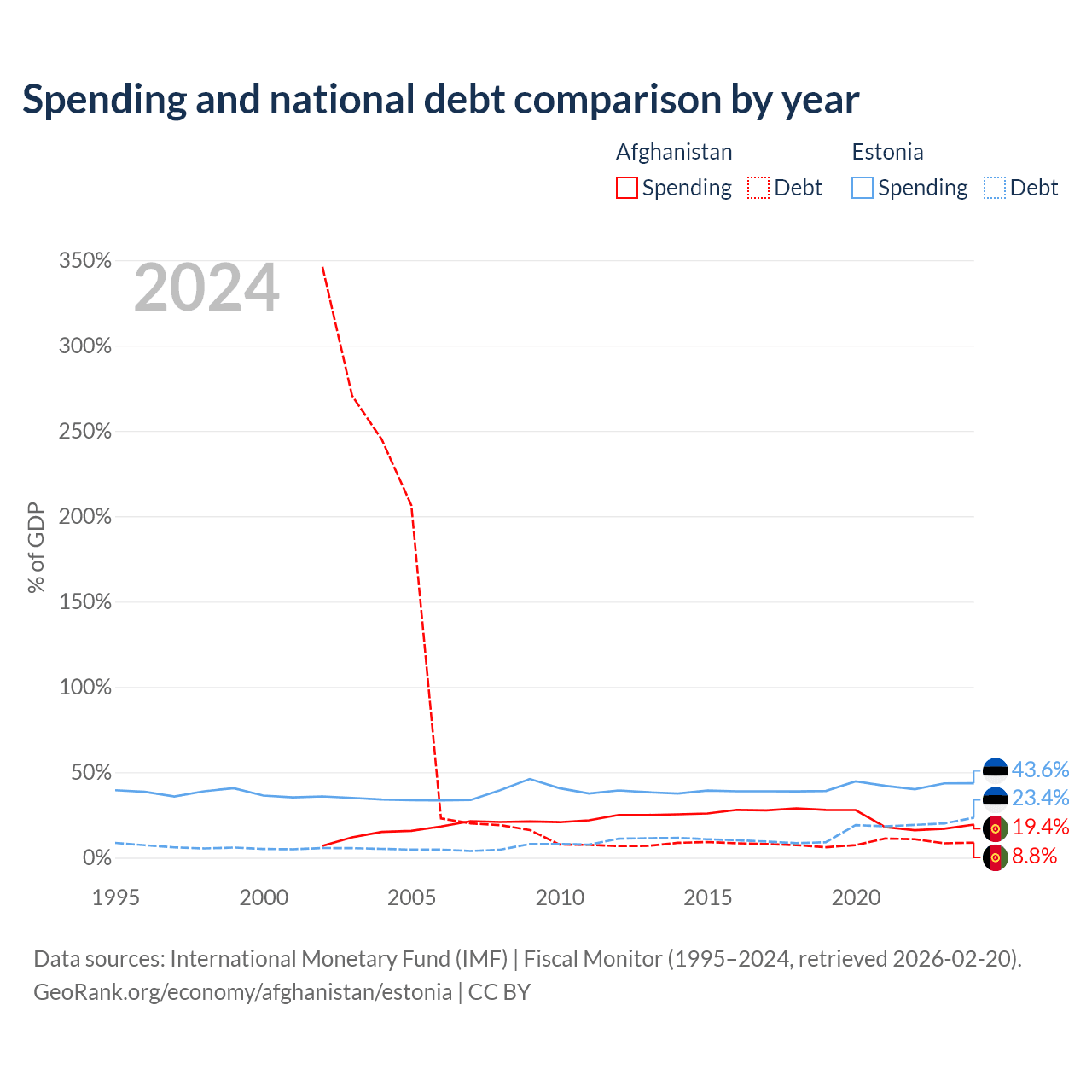 Afghanistan has $1.44B in government debt (8.8% of GDP), compared to $10.1B (23.4% of GDP) in Estonia.
