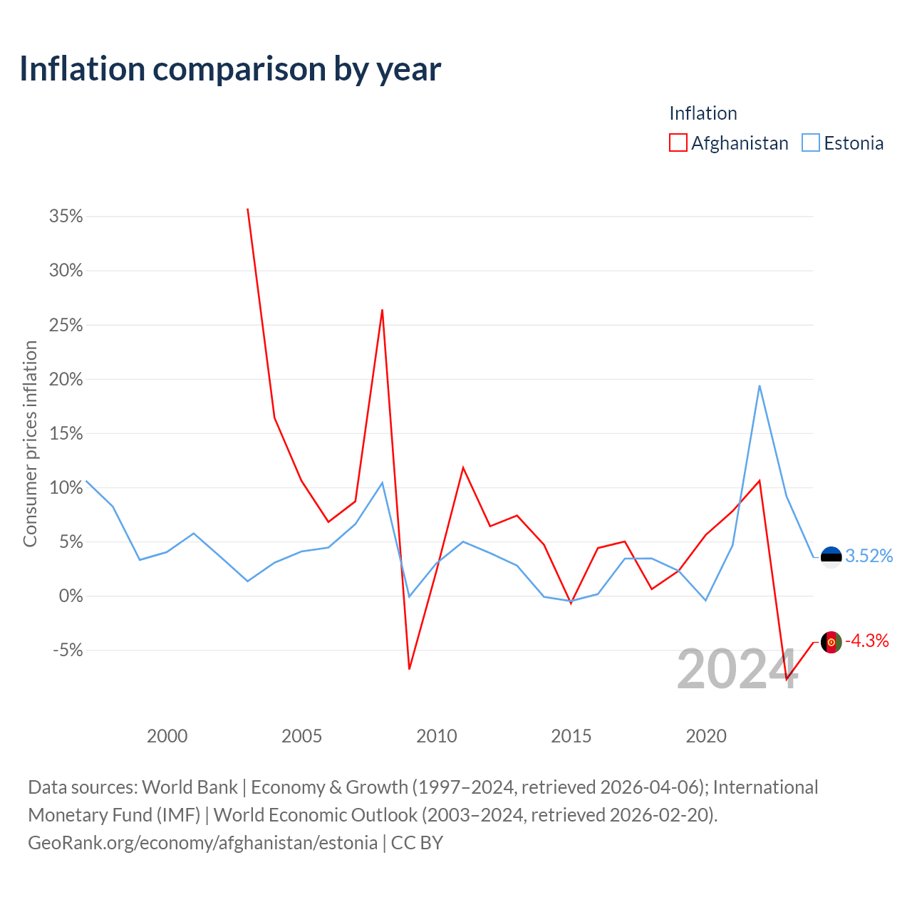 Afghanistan's GDP per capita is $414, ranking 196/197, compared to $31,428 in Estonia, ranking 40/197. Adjusted for purchasing power (GDP per capita PPP), Afghanistan ranks 184th at $2,202, while Estonia ranks 45th at $49,969.