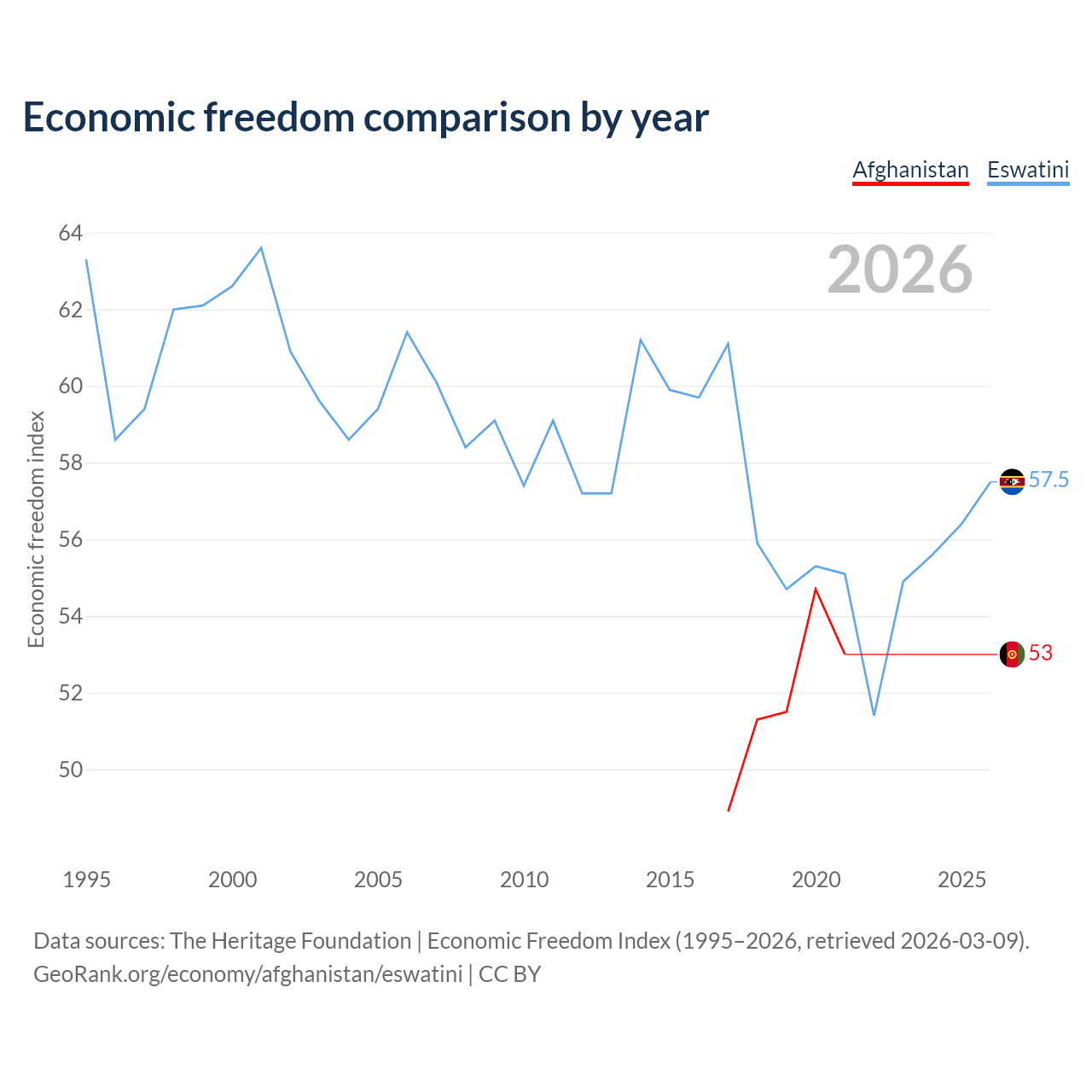 The Economic Freedom Index for Afghanistan is 53, ranking 142/197, compared to 57.5 for Eswatini, ranking 116/197. The chart above displays a comparison of annual changes in economic freedom indexes.