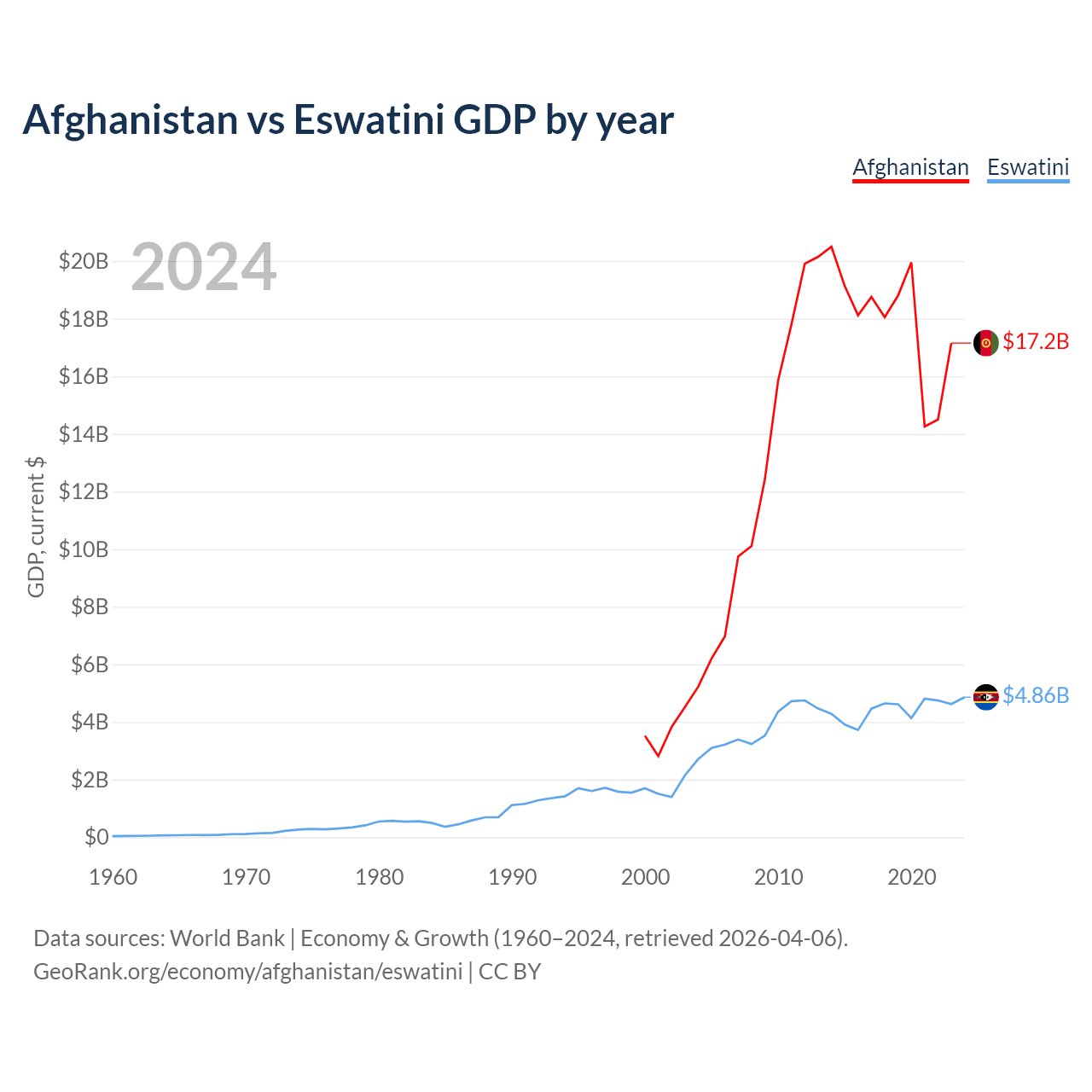 Afghanistan has a GDP of $17.2B compared to $4.86B for Eswatini, ranking 137/197 and 162/197 by economy size, respectively.