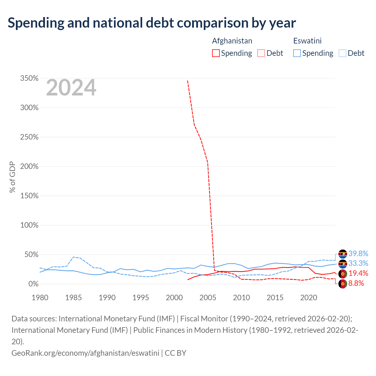 Afghanistan has $1.44B in government debt (8.8% of GDP), compared to $1.93B (39.8% of GDP) in Eswatini.