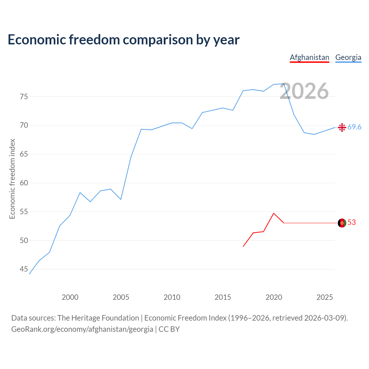 The Economic Freedom Index for Afghanistan is 53, ranking 142/197, compared to 69.6 for Georgia, ranking 41/197. The chart above displays a comparison of annual changes in economic freedom indexes.