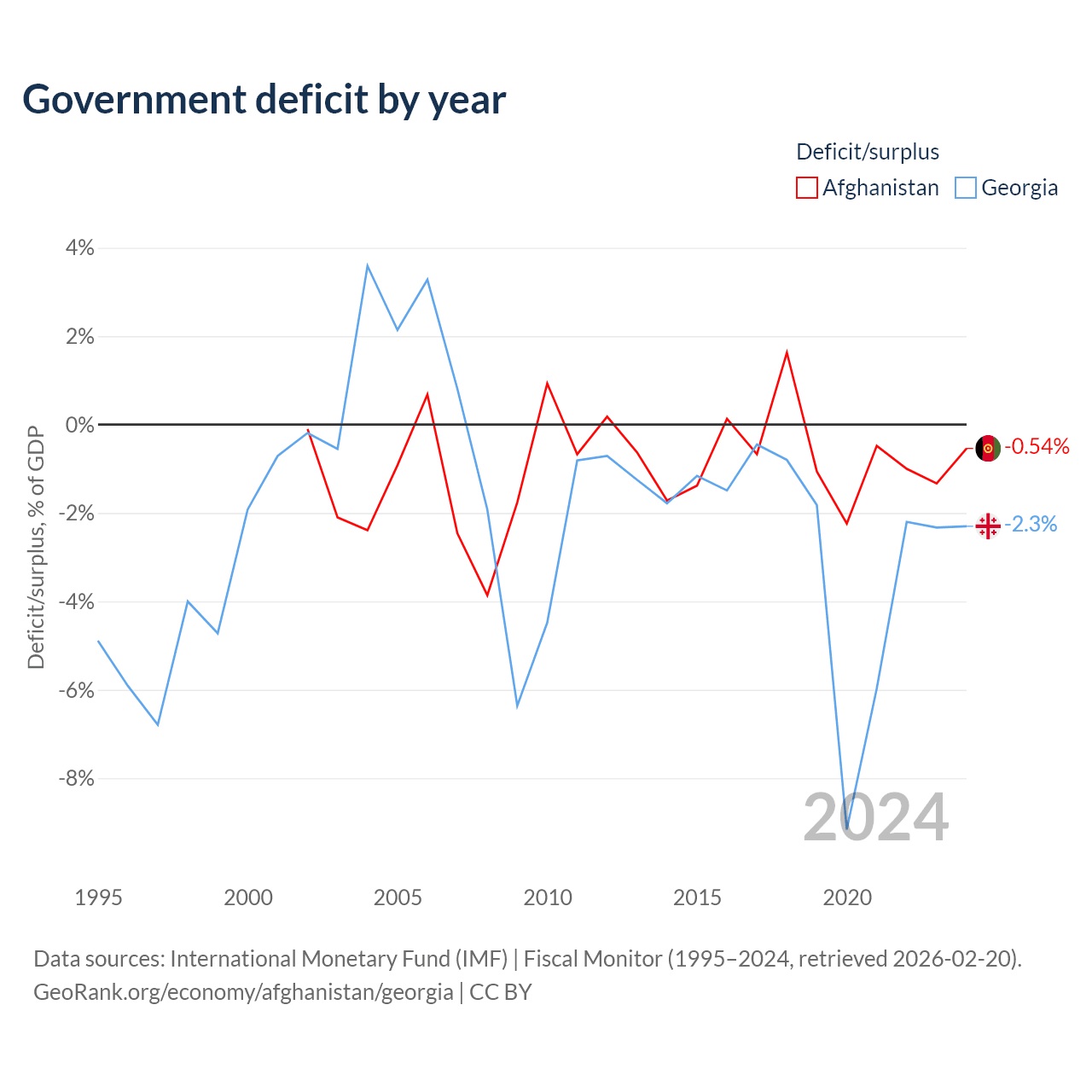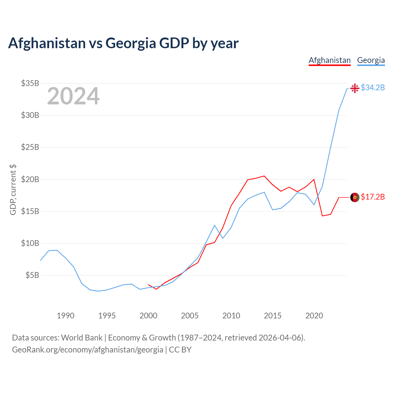 Afghanistan has a GDP of $17.2B compared to $34.2B for Georgia, ranking 137/197 and 107/197 by economy size, respectively.