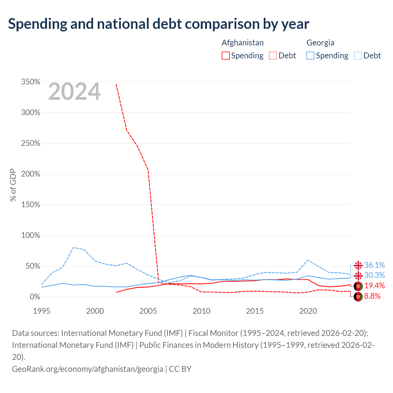 Afghanistan has $1.44B in government debt (8.8% of GDP), compared to $12.3B (36.1% of GDP) in Georgia.