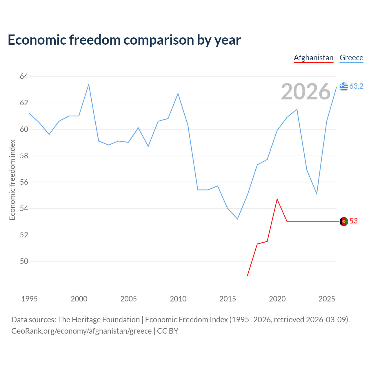 The Economic Freedom Index for Afghanistan is 53, ranking 142/197, compared to 63.2 for Greece, ranking 82/197. The chart above displays a comparison of annual changes in economic freedom indexes.