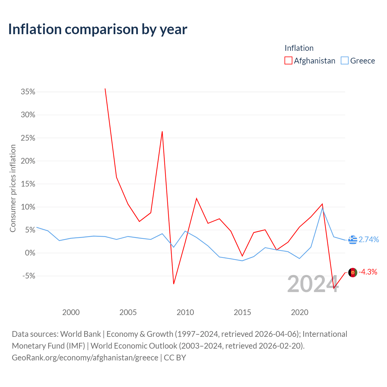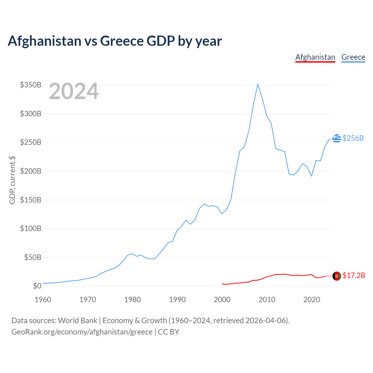 Afghanistan has a GDP of $17.2B compared to $256B for Greece, ranking 137/197 and 53/197 by economy size, respectively.