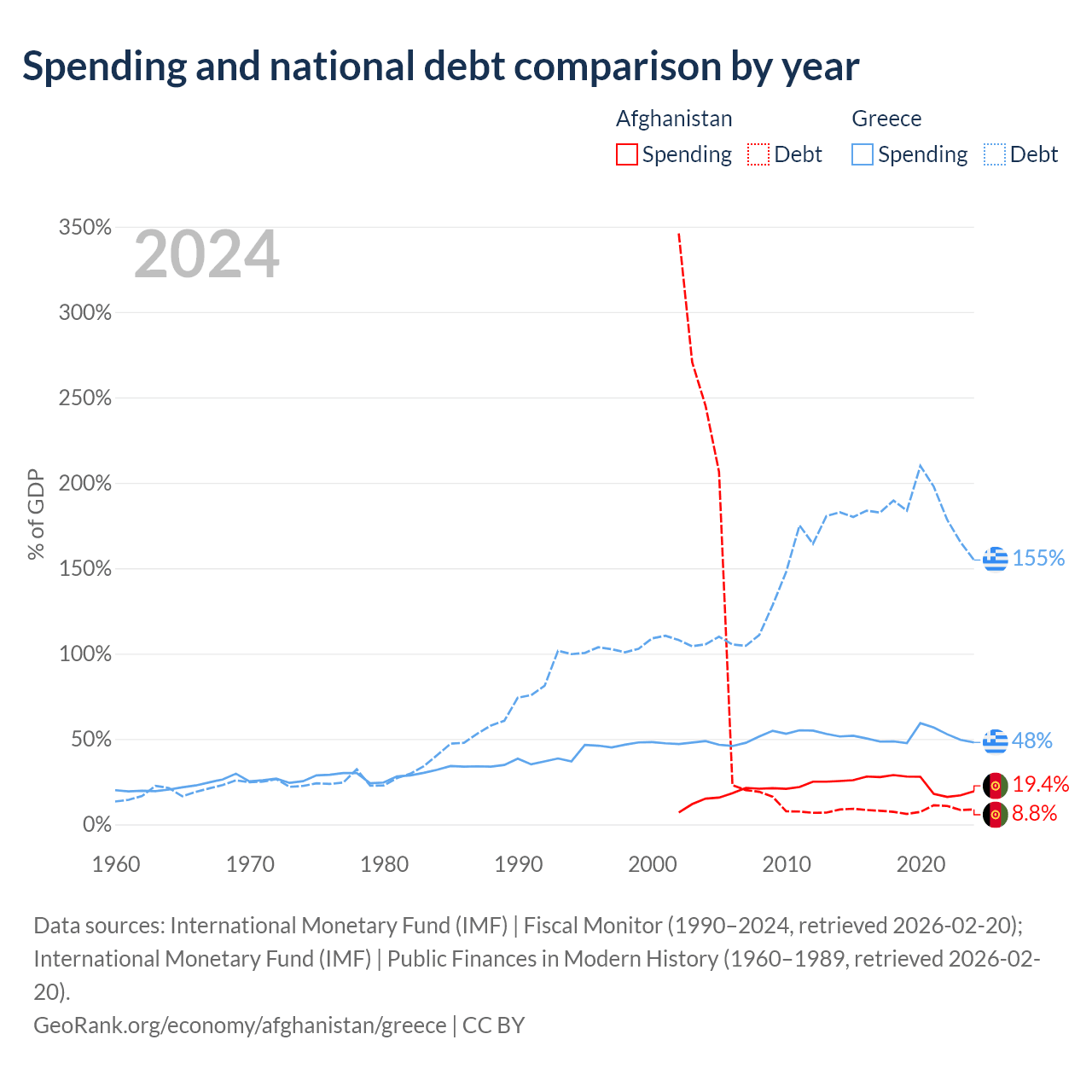 Afghanistan has $1.44B in government debt (8.8% of GDP), compared to $397B (154.8% of GDP) in Greece.