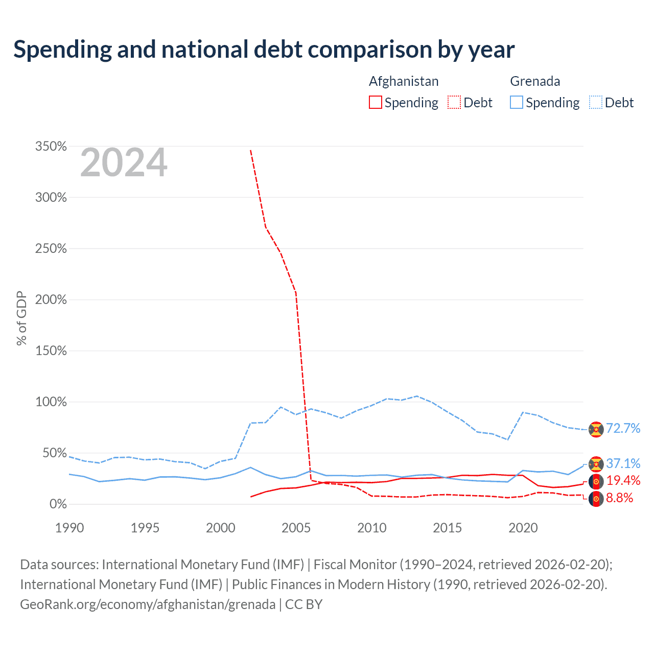 Afghanistan has $1.44B in government debt (8.8% of GDP), compared to $997M (72.7% of GDP) in Grenada.