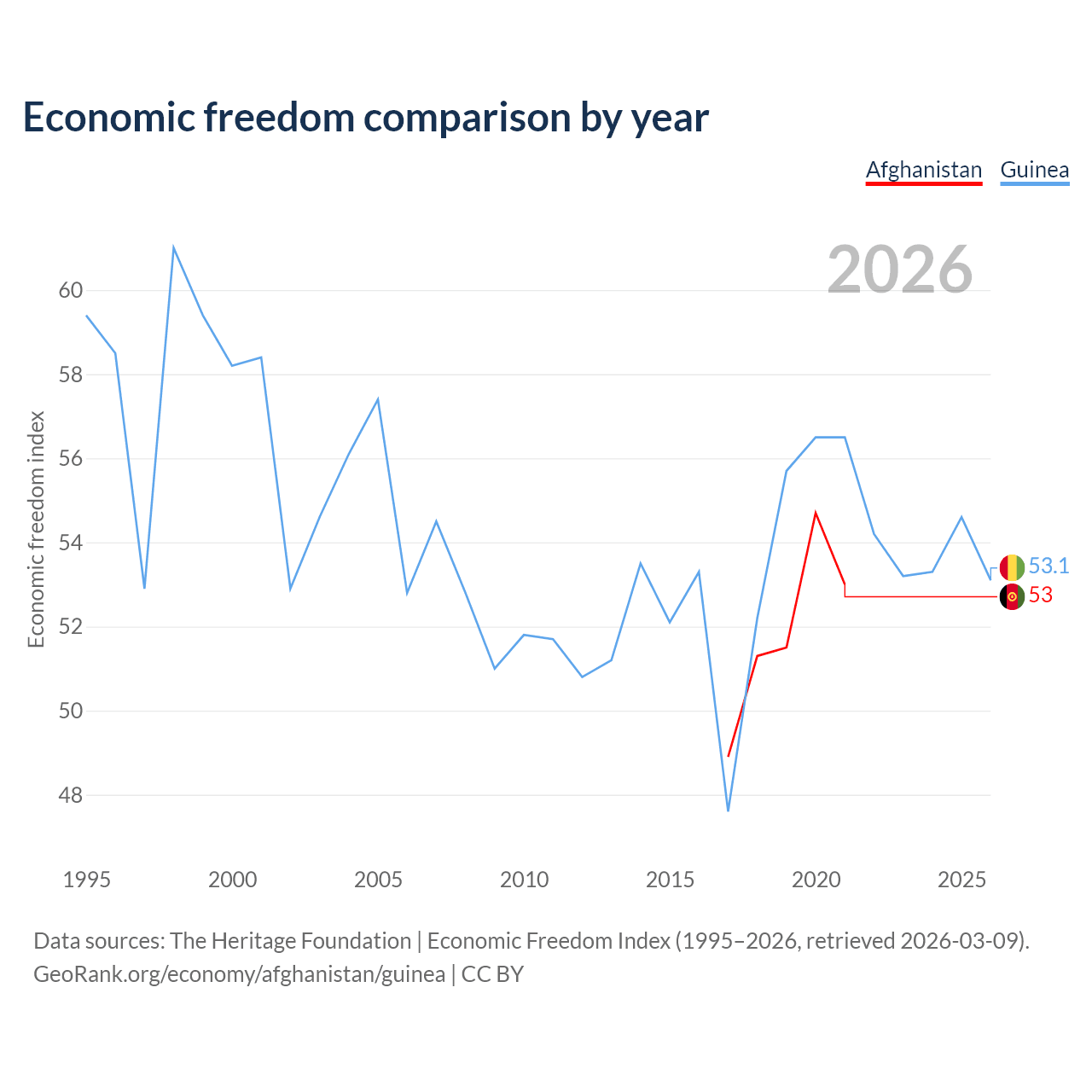 The Economic Freedom Index for Afghanistan is 53, ranking 142/197, compared to 53.1 for Guinea, ranking 141/197. The chart above displays a comparison of annual changes in economic freedom indexes.