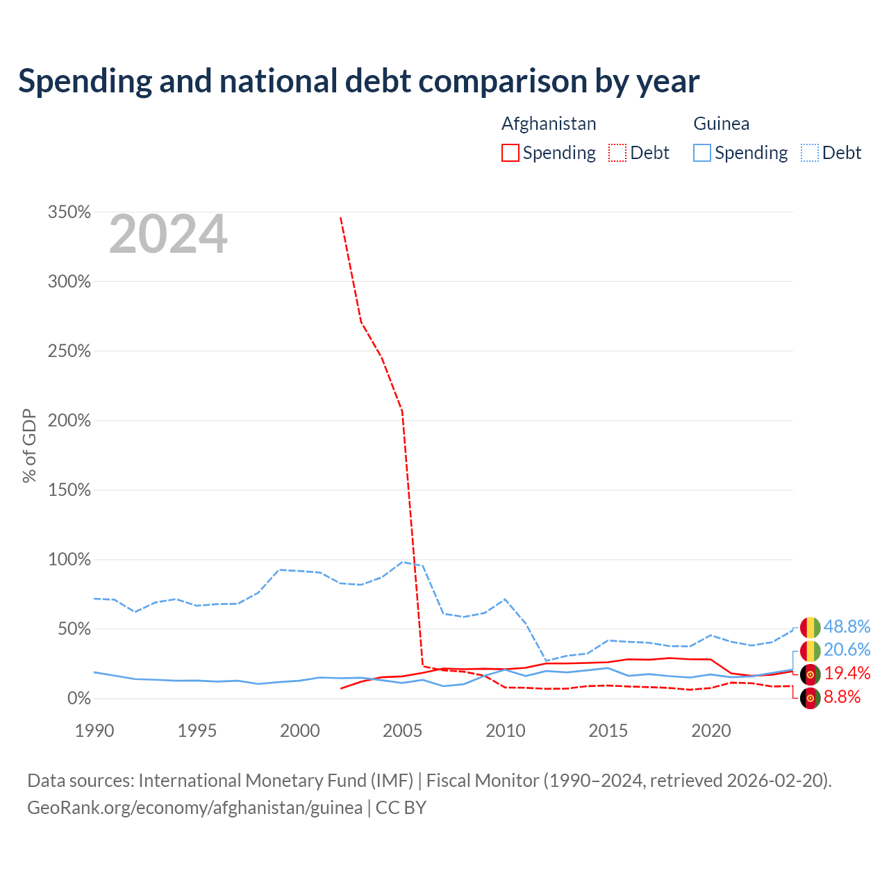 Afghanistan has $1.44B in government debt (8.8% of GDP), compared to $12.2B (48.8% of GDP) in Guinea.