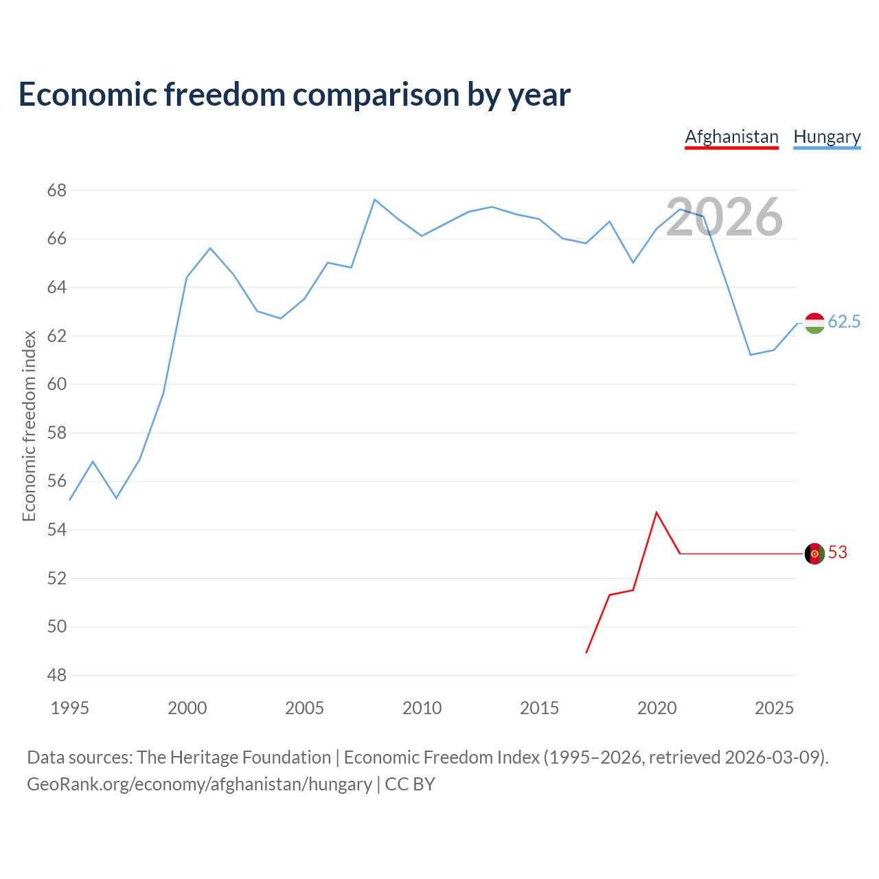 The Economic Freedom Index for Afghanistan is 53, ranking 142/197, compared to 62.5 for Hungary, ranking 86/197. The chart above displays a comparison of annual changes in economic freedom indexes.