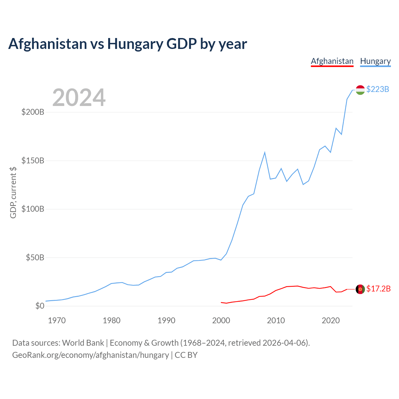 Afghanistan has a GDP of $17.2B compared to $223B for Hungary, ranking 137/197 and 55/197 by economy size, respectively.