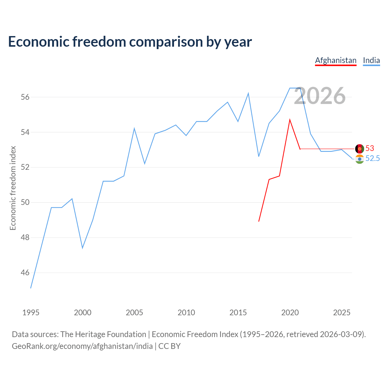 The Economic Freedom Index for Afghanistan is 53, ranking 142/197, compared to 52.5 for India, ranking 146/197. The chart above displays a comparison of annual changes in economic freedom indexes.