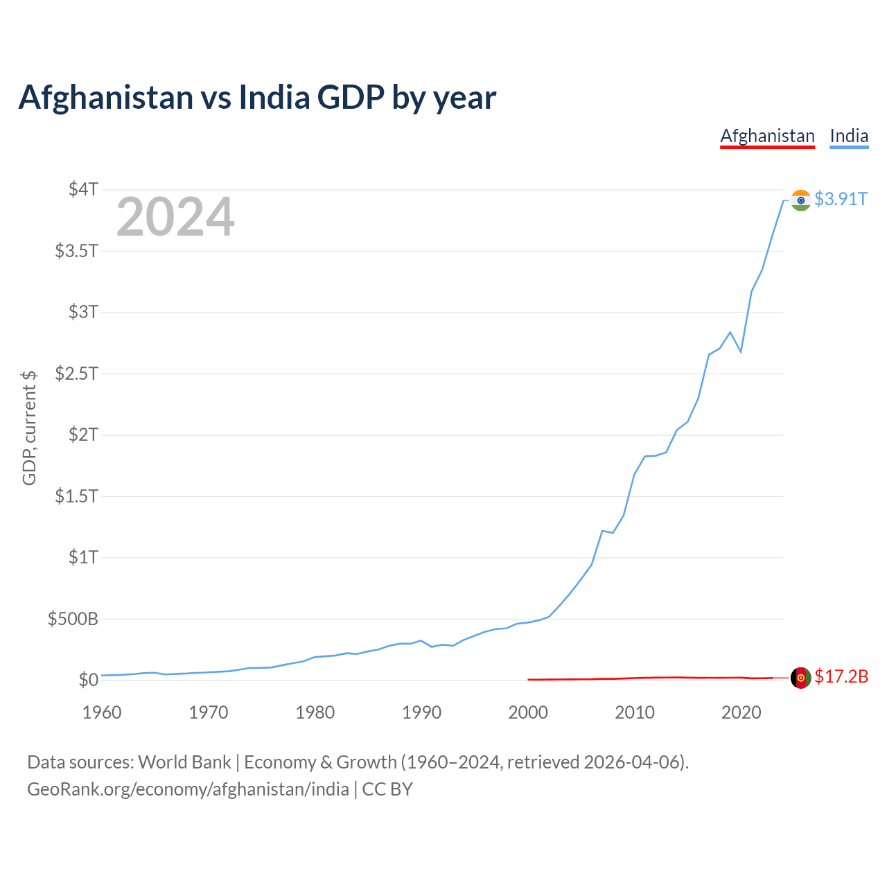 Afghanistan has a GDP of $17.2B compared to $3.91T for India, ranking 137/197 and 5/197 by economy size, respectively.