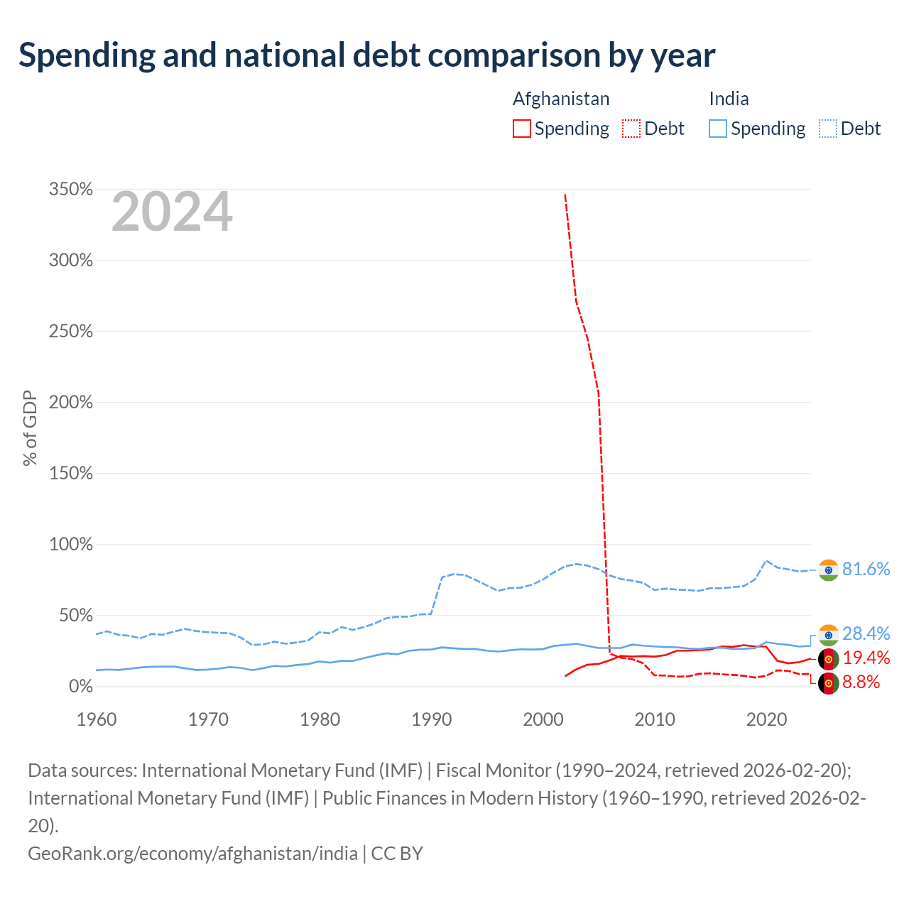 Afghanistan has $1.44B in government debt (8.8% of GDP), compared to $3.19T (81.6% of GDP) in India.
