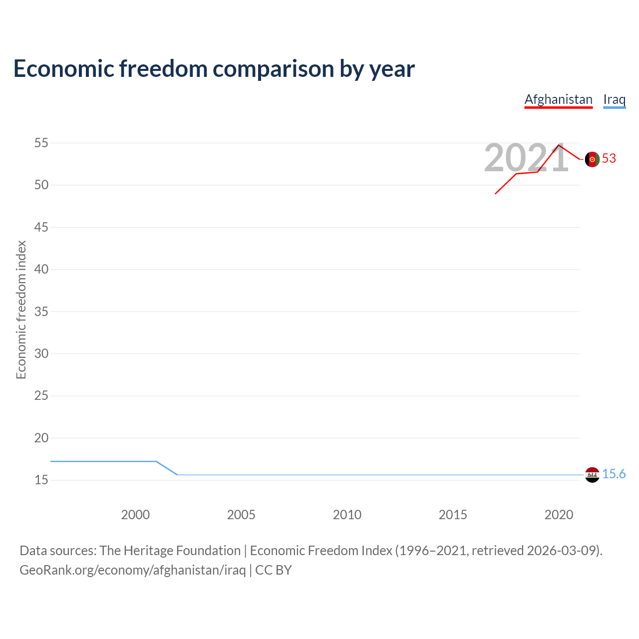 The Economic Freedom Index for Afghanistan is 53, ranking 142/197, compared to 15.6 for Iraq, ranking 196/197. The chart above displays a comparison of annual changes in economic freedom indexes.