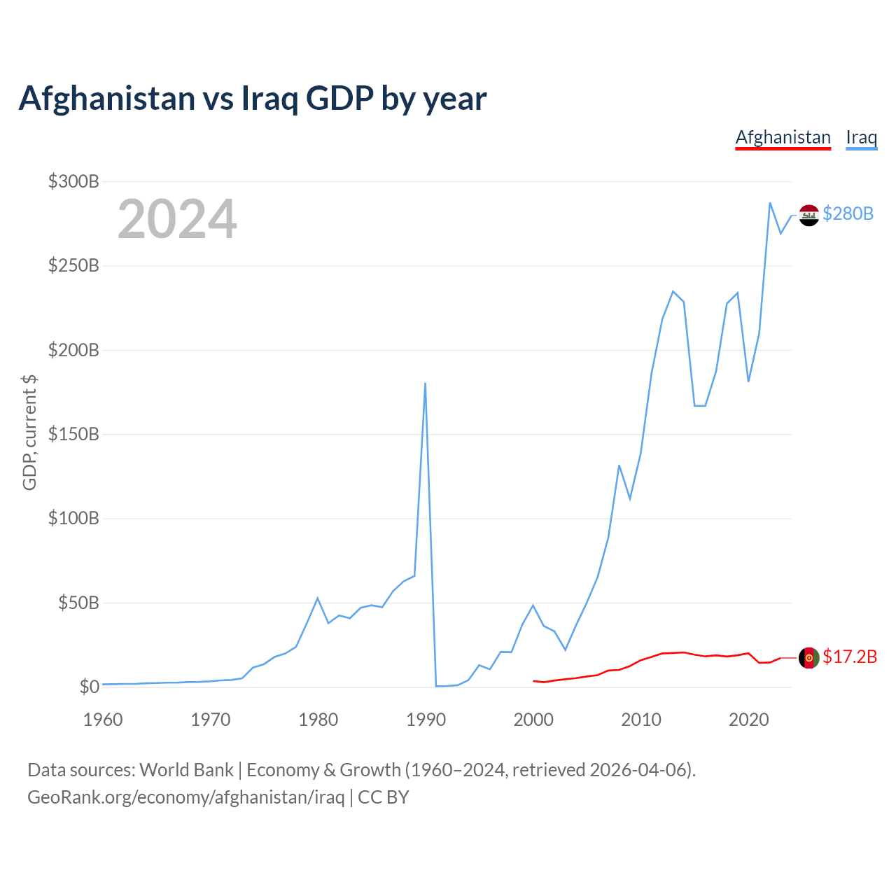Afghanistan has a GDP of $17.2B compared to $280B for Iraq, ranking 137/197 and 50/197 by economy size, respectively.