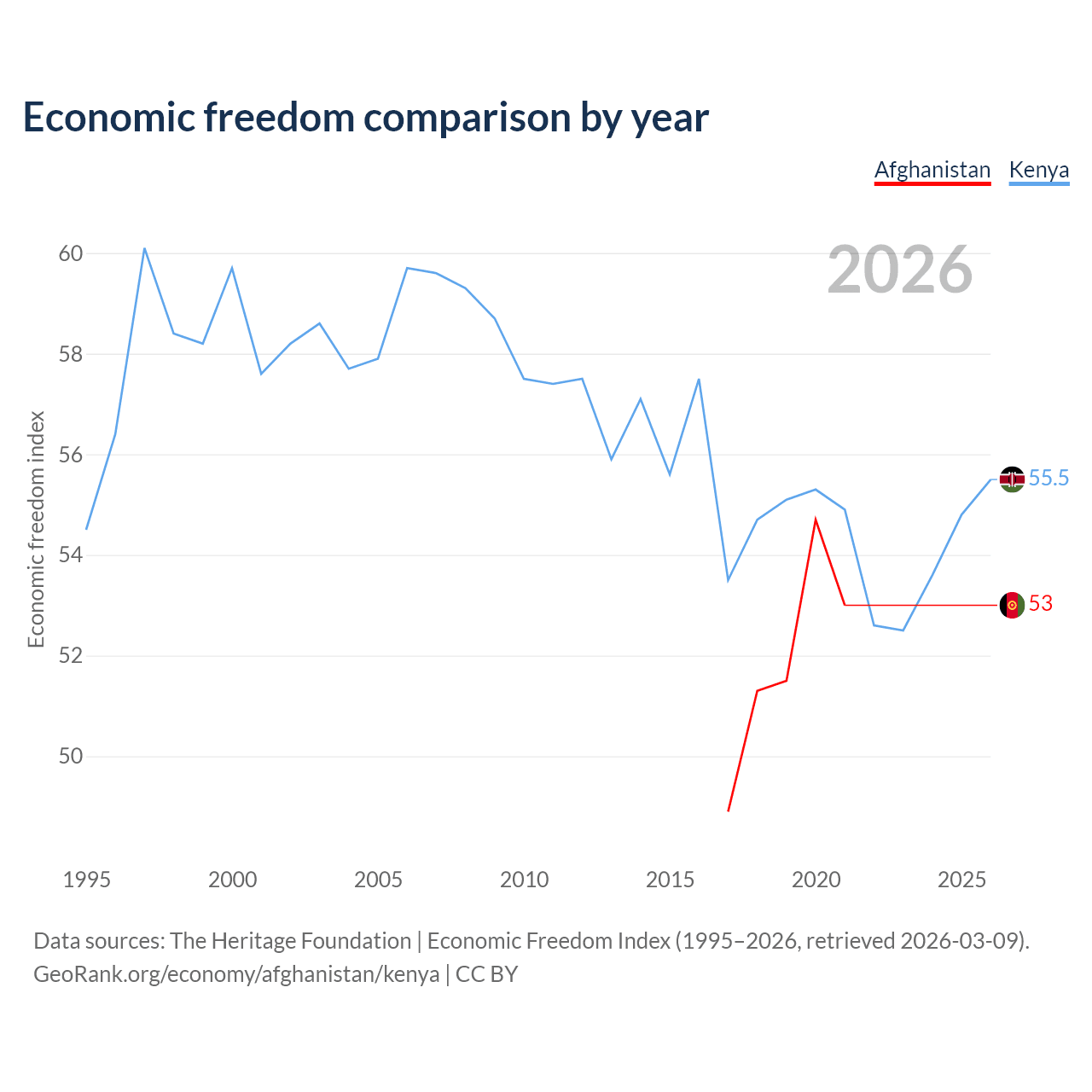 The Economic Freedom Index for Afghanistan is 53, ranking 142/197, compared to 55.5 for Kenya, ranking 128/197. The chart above displays a comparison of annual changes in economic freedom indexes.