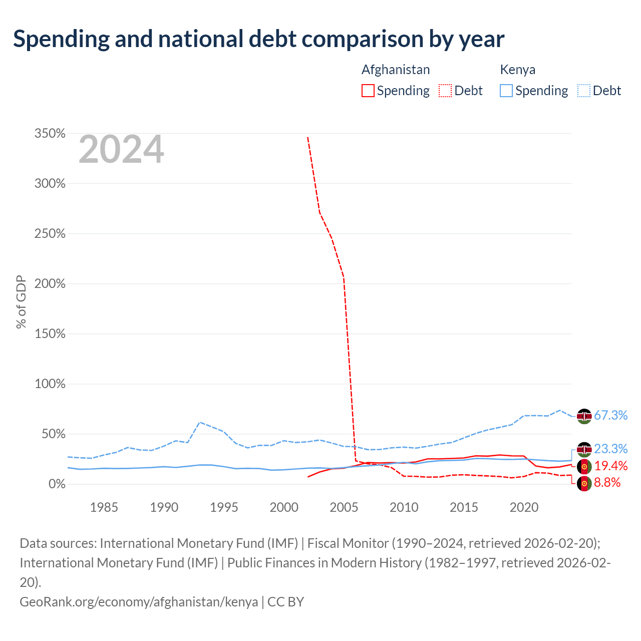 Afghanistan has $1.44B in government debt (8.8% of GDP), compared to $81B (67.3% of GDP) in Kenya.