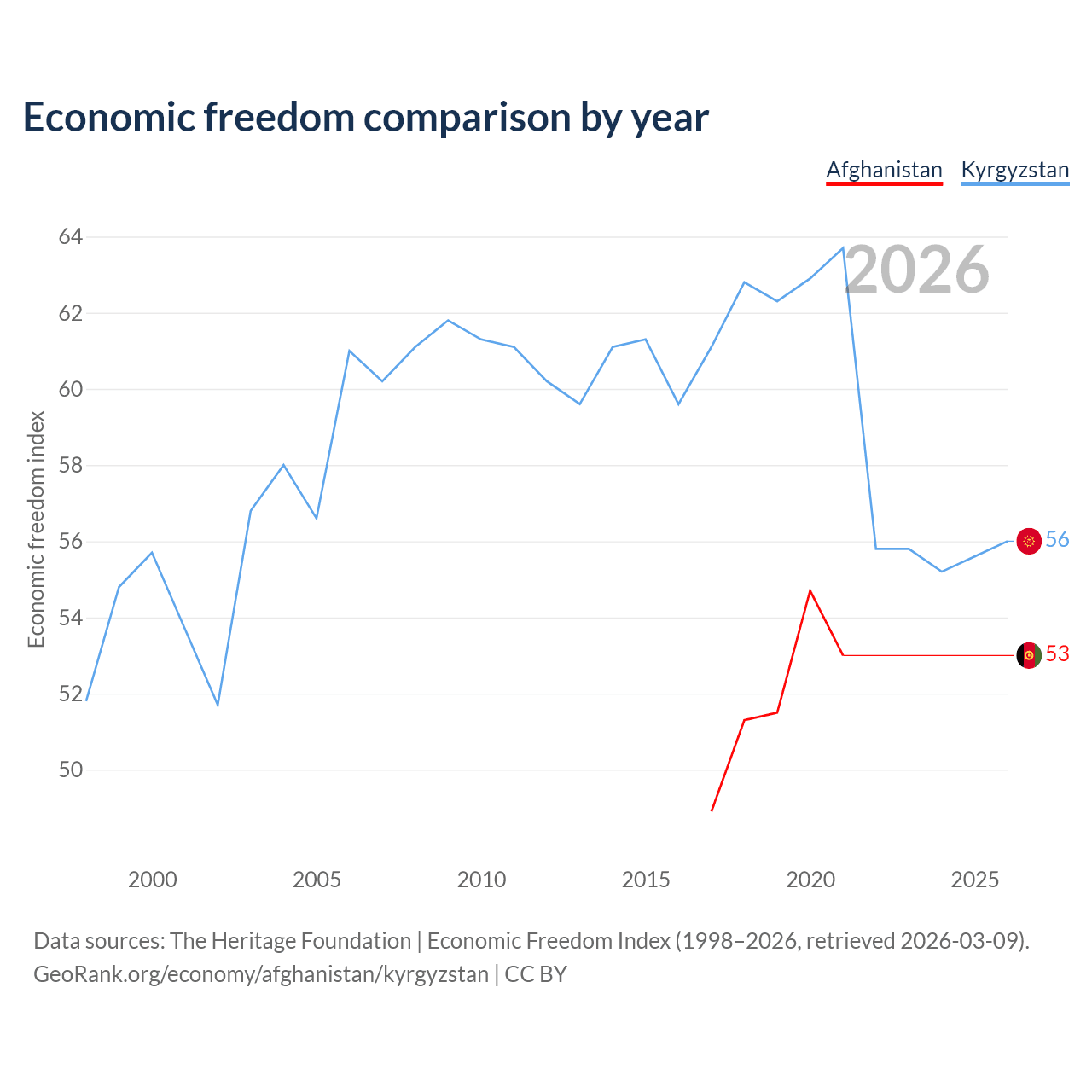 The Economic Freedom Index for Afghanistan is 53, ranking 142/197, compared to 56 for Kyrgyzstan, ranking 126/197. The chart above displays a comparison of annual changes in economic freedom indexes.