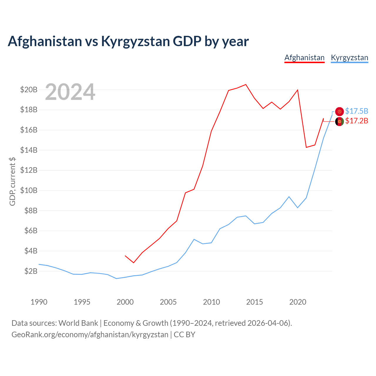 Afghanistan has a GDP of $17.2B compared to $17.5B for Kyrgyzstan, ranking 137/197 and 135/197 by economy size, respectively.