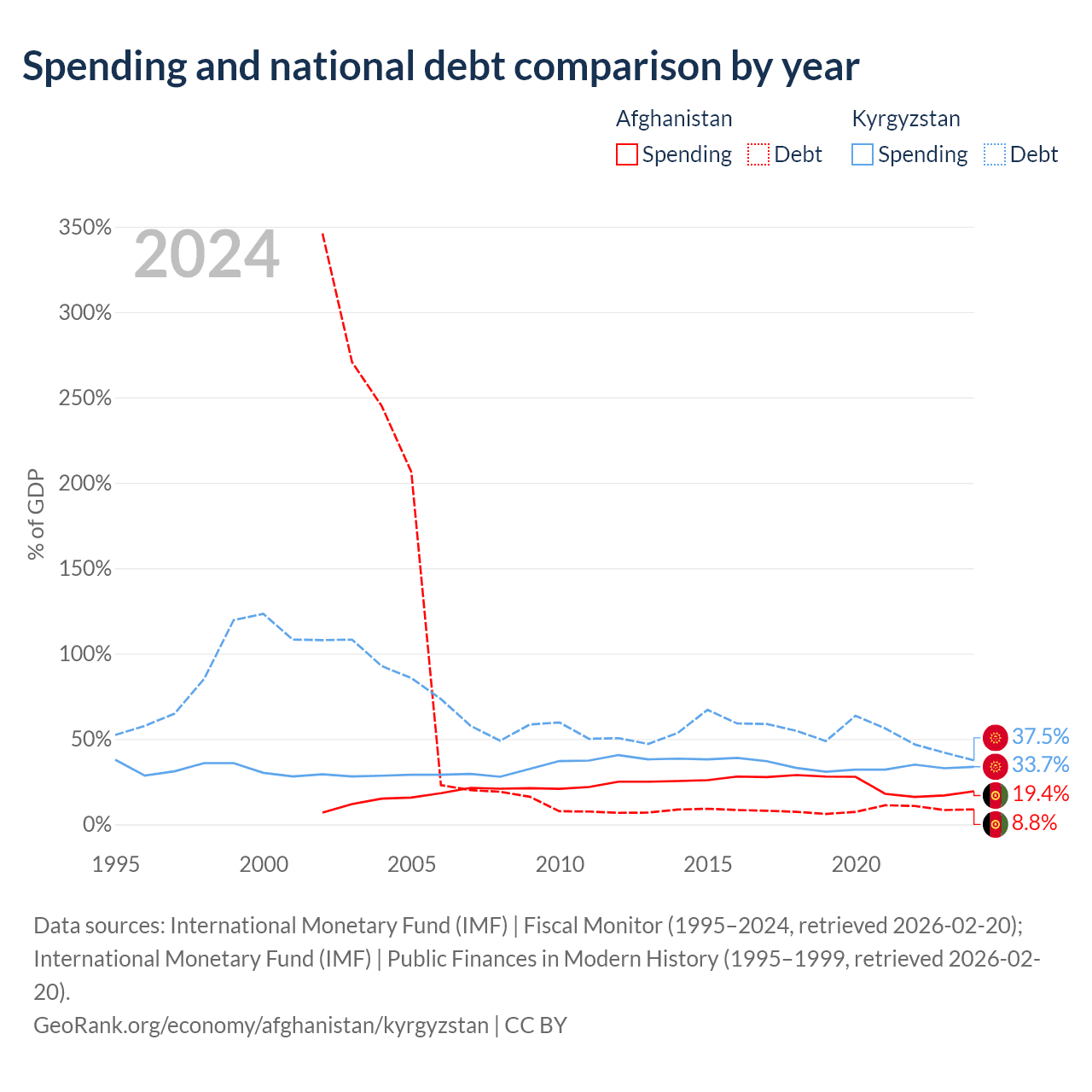 Afghanistan has $1.44B in government debt (8.8% of GDP), compared to $6.56B (37.5% of GDP) in Kyrgyzstan.