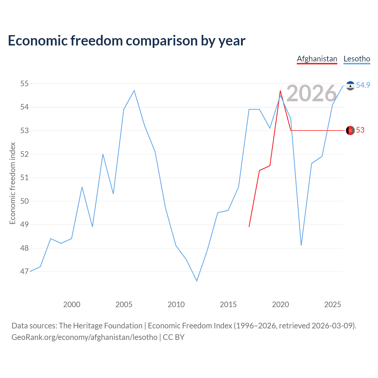 The Economic Freedom Index for Afghanistan is 53, ranking 142/197, compared to 54.9 for Lesotho, ranking 130/197. The chart above displays a comparison of annual changes in economic freedom indexes.