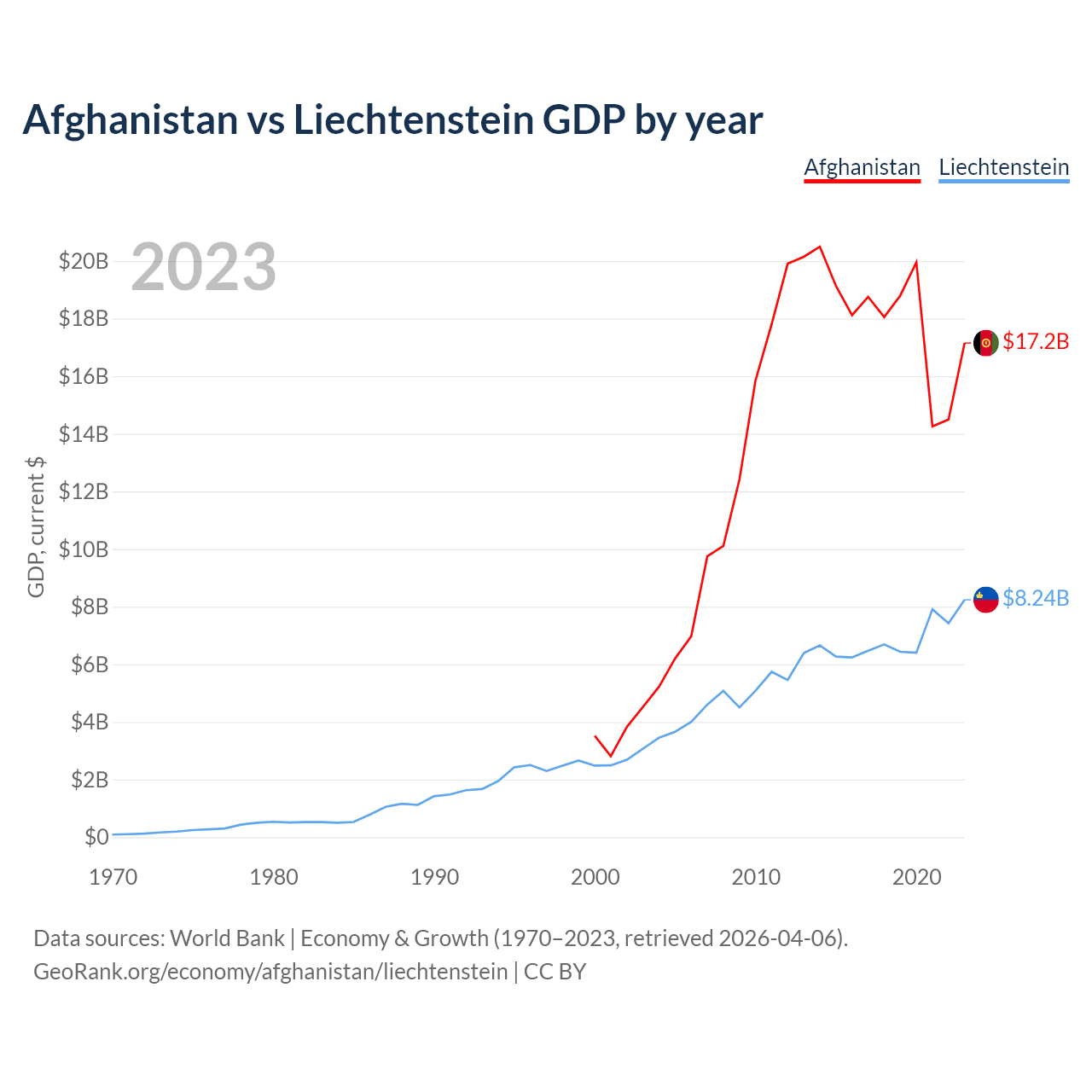 Afghanistan has a GDP of $17.2B compared to $8.24B for Liechtenstein, ranking 137/197 and 156/197 by economy size, respectively.