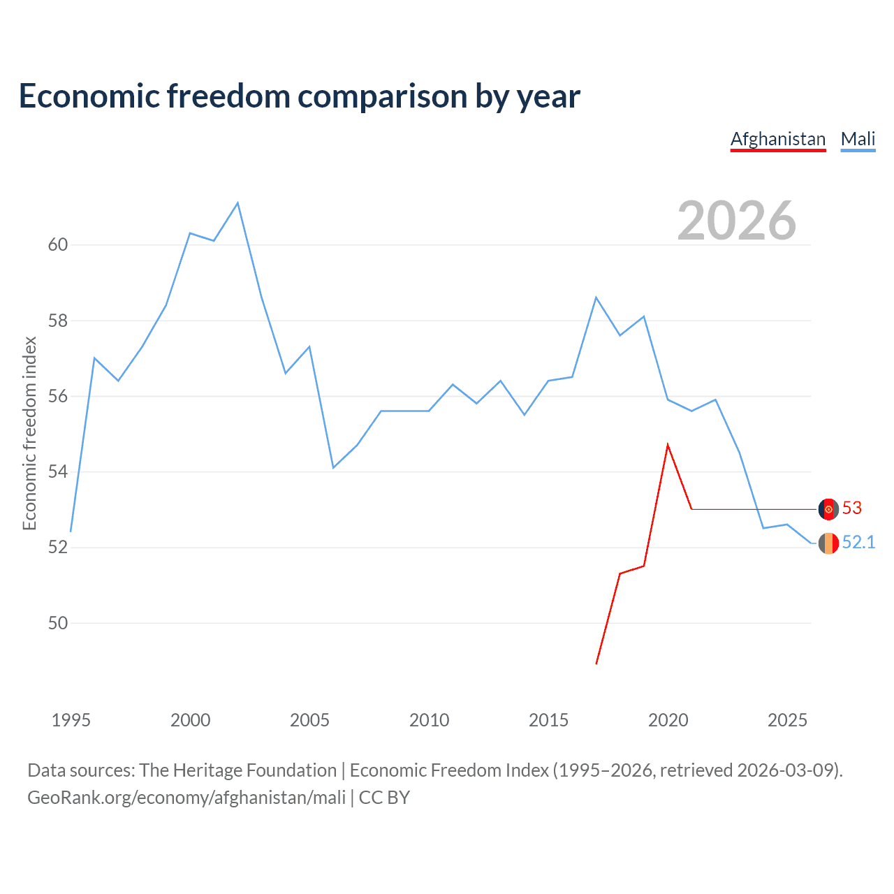 The Economic Freedom Index for Afghanistan is 53, ranking 142/197, compared to 52.1 for Mali, ranking 150/197. The chart above displays a comparison of annual changes in economic freedom indexes.