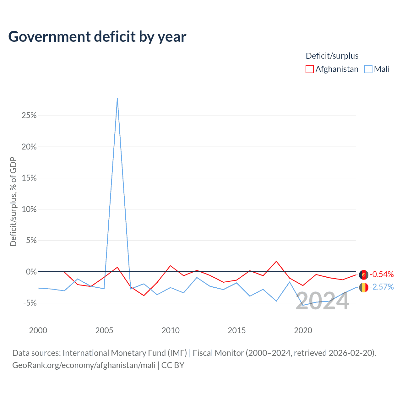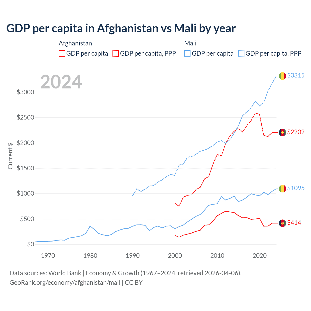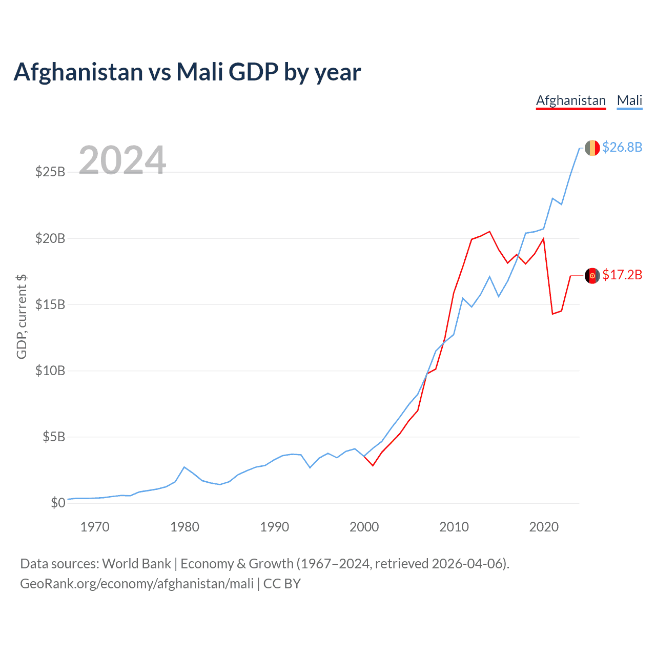 Afghanistan has a GDP of $17.2B compared to $26.8B for Mali, ranking 137/197 and 113/197 by economy size, respectively.