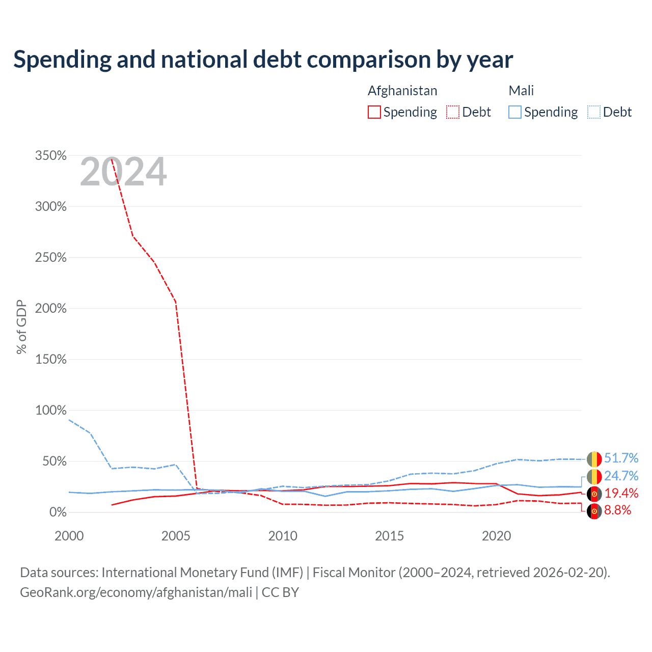 Afghanistan has $1.44B in government debt (8.8% of GDP), compared to $13.9B (51.7% of GDP) in Mali.