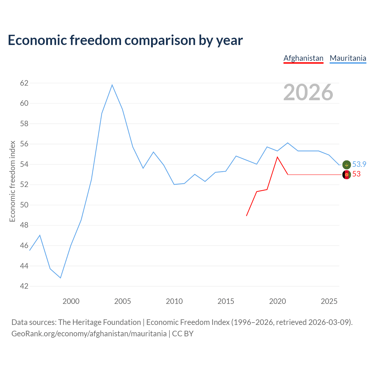 The Economic Freedom Index for Afghanistan is 53, ranking 142/197, compared to 53.9 for Mauritania, ranking 136/197. The chart above displays a comparison of annual changes in economic freedom indexes.